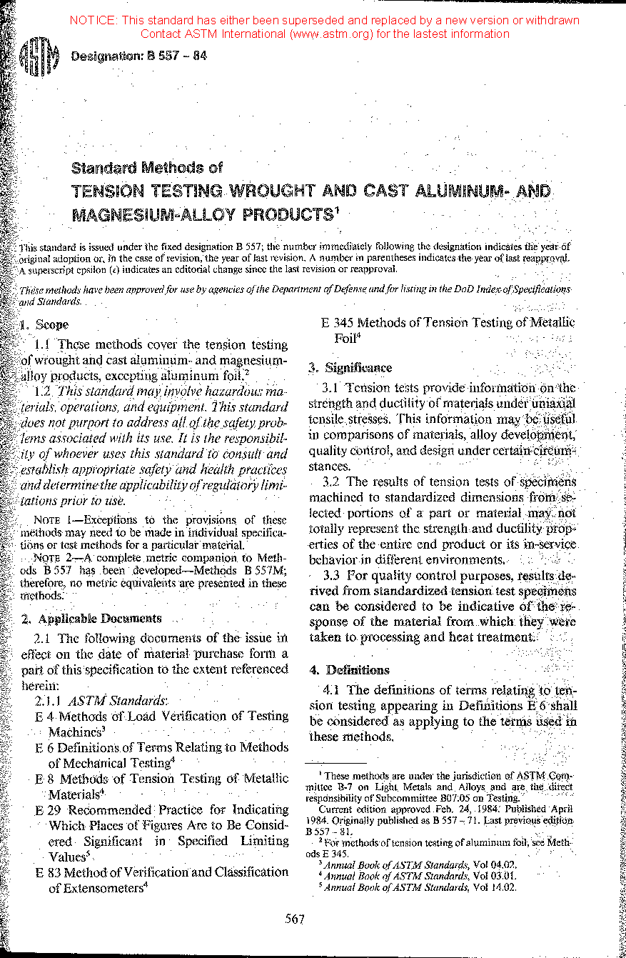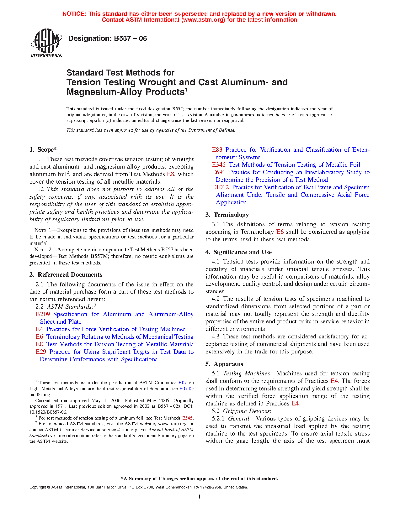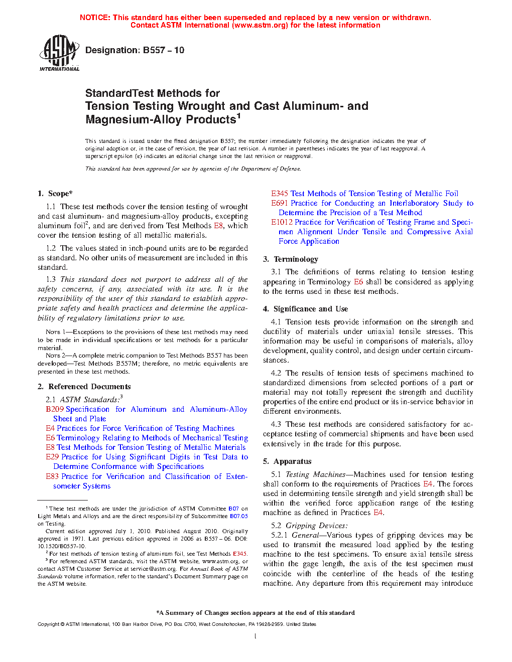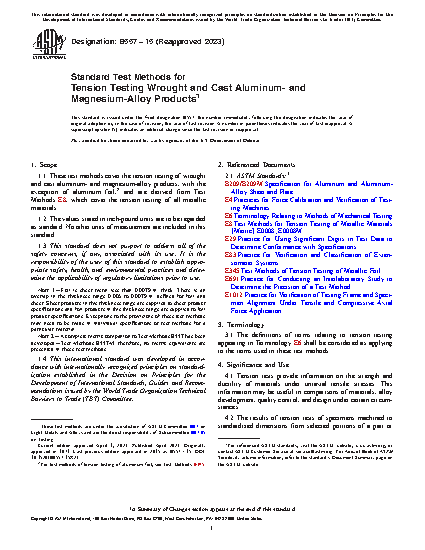 1.1 These test methods cover the tension testing of wrought and cast aluminum- and magnesium-alloy products, with the exception of aluminum foil,2 and are derived from Test Methods E8, which cover the tension testing of all metallic materials.