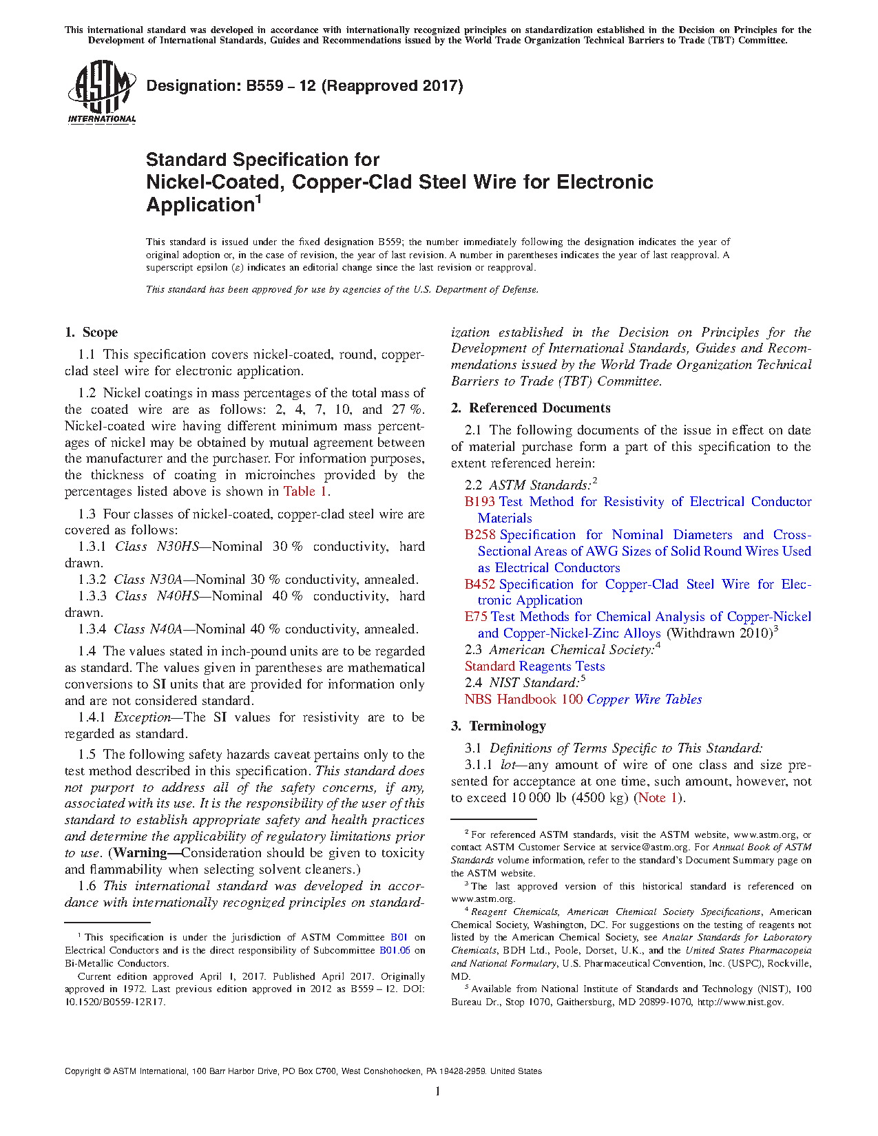 1.3 Four classes of nickel-coated, copper-clad steel wire are covered as follows: