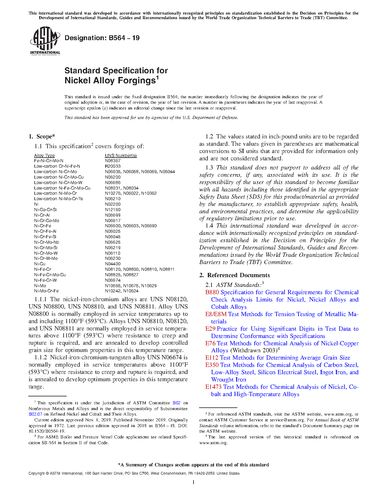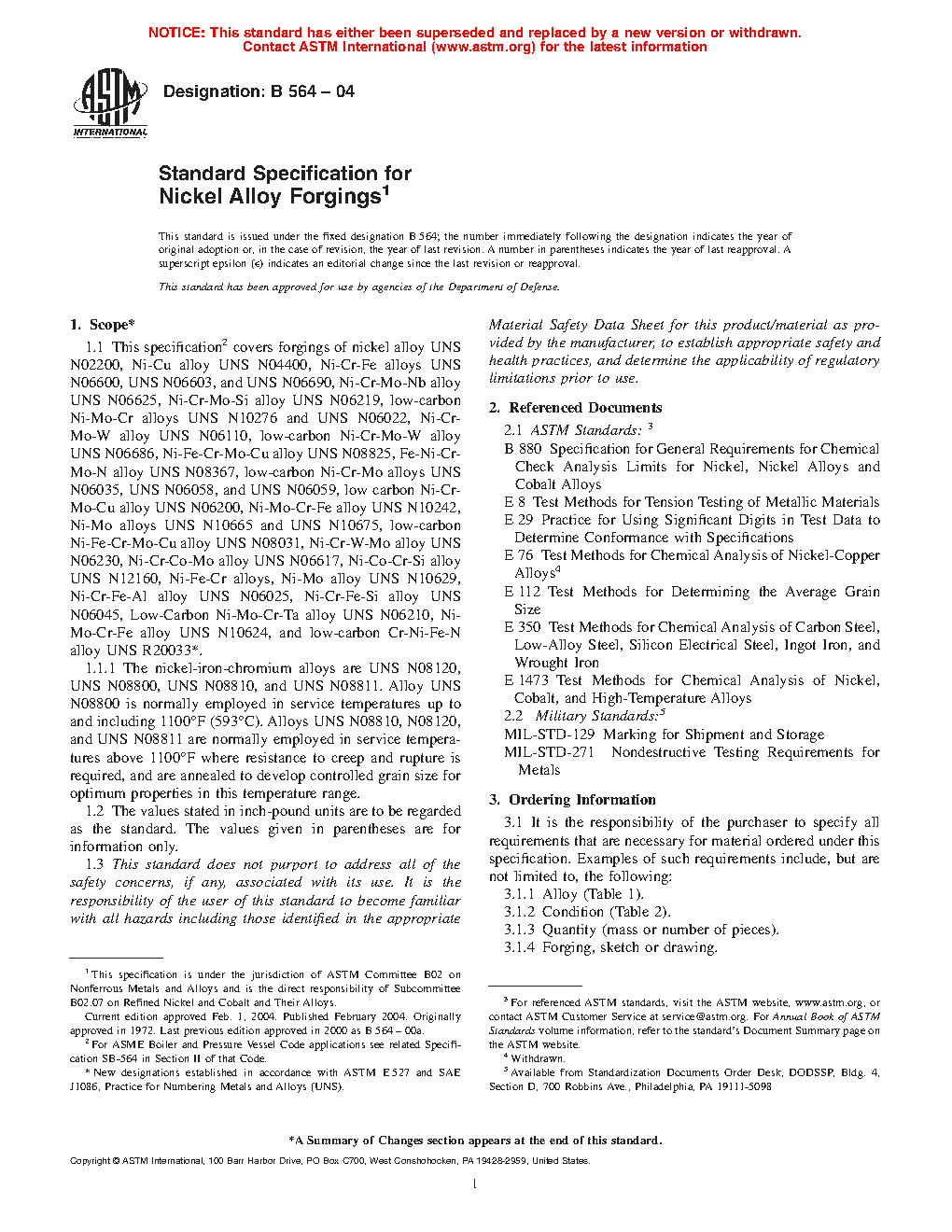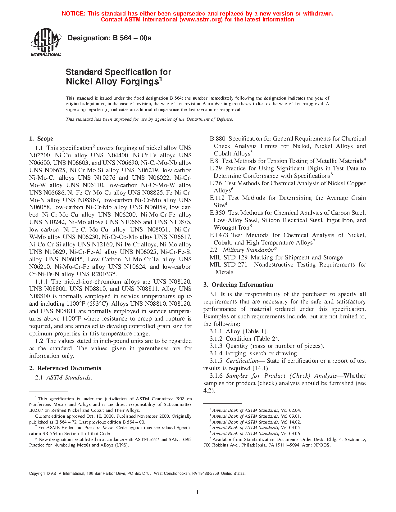 This specification covers nickel alloy forgings. These alloys are classified into different grades according to their chemical composition. A chemical analysis shall be employed on each alloy in order to determine its chemical composition. Grain size and mechanical properties like tensile strength, yield strength, and elongation shall be measured. A tension test and nondestructive ultrasonic test shall be done on each specimen.