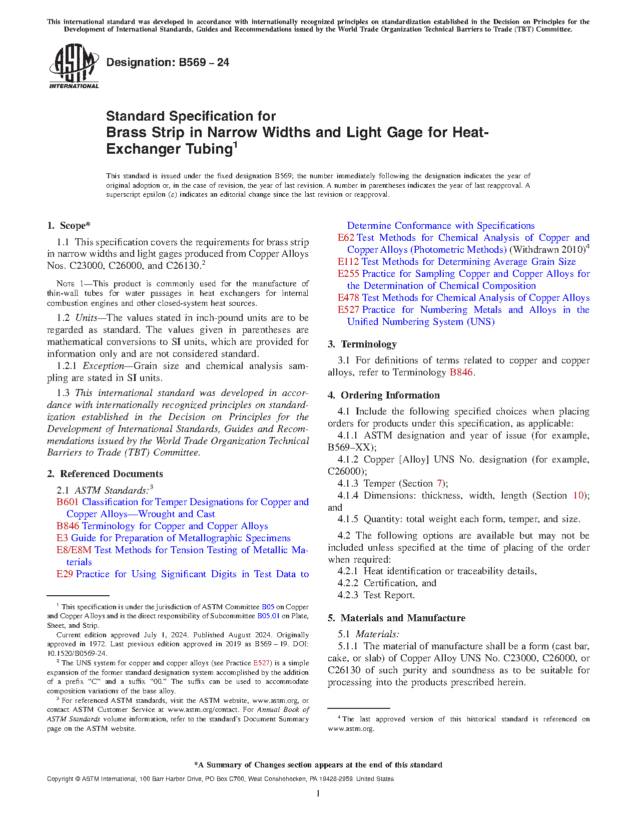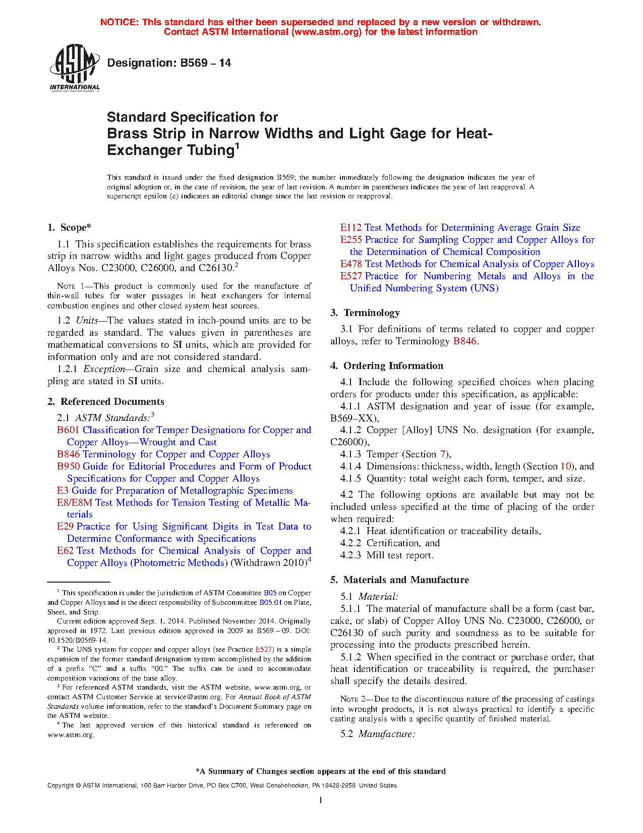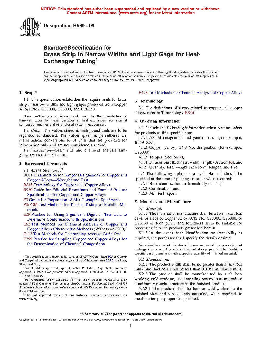 1.1 This specification establishes the requirements for brass strip in narrow widths and light gages produced from Copper Alloys Nos. C23000, C26000, and C26130.2