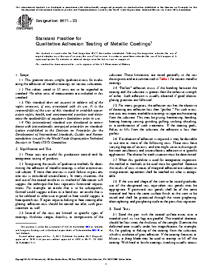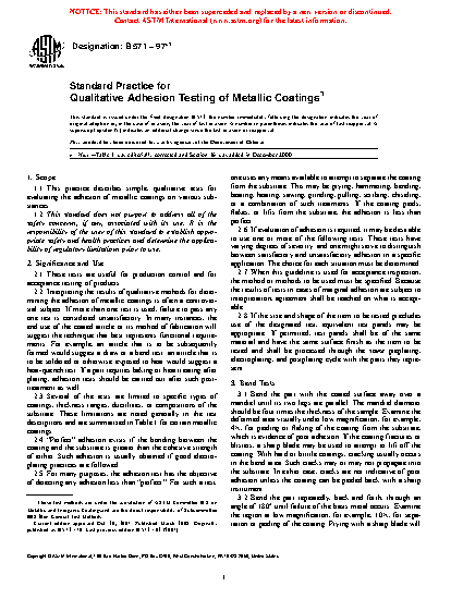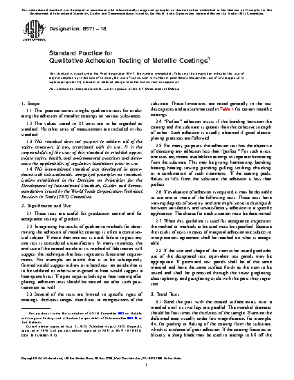 1.1 This practice covers simple, qualitative tests for evaluating the adhesion of metallic coatings on various substances.