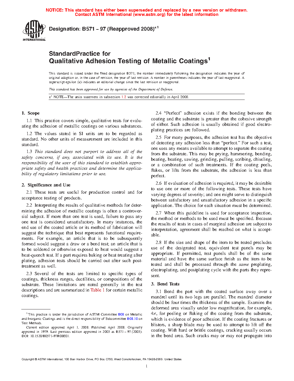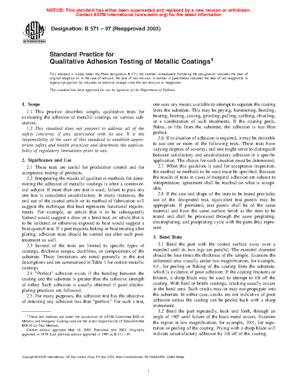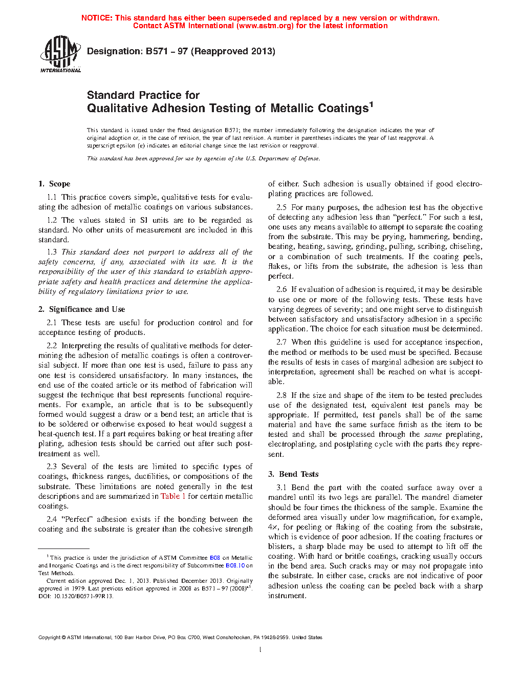 2.3 Several of the tests are limited to specific types of coatings, thickness ranges, ductilities, or compositions of the substrate. These limitations are noted generally in the test descriptions and are summarized in Table 1 for certain metallic coatings.