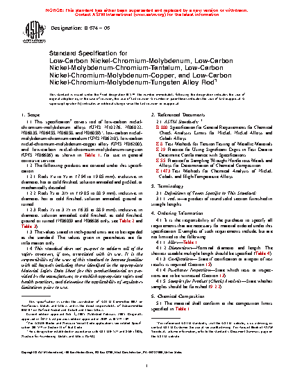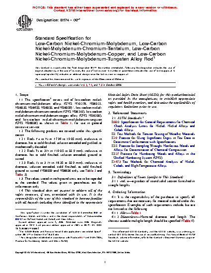 This specification2 covers rod of low-carbon nickel-chromium- molybdenum alloys (UNS N10276, N06022, N06035, N06455, N06058, and N06059), low-carbon nickel-molybdenum- chromium-tantalum (UNS N06210), low-carbon nickel-chromium-molybdenum-copper alloy (UNS N06200), and low-carbon nickel-chromium-molybdenum-tungsten (UNS N06686), for use in general corrosive service. Product and chemical analyses shall be performed on the materials and shall conform to the required chemical composition in molybdenum, chromium, iron, tungsten, cobalt, carbon, silicon, manganese, vanadium, phosphorus, sulfur, titanium, nickel, aluminum, copper, and tantalum. Tension test shall be performed and shall comply to required mechanical properties for hot or cold finished, solution annealed rods such as tensile strength, yield strength, and elongation.