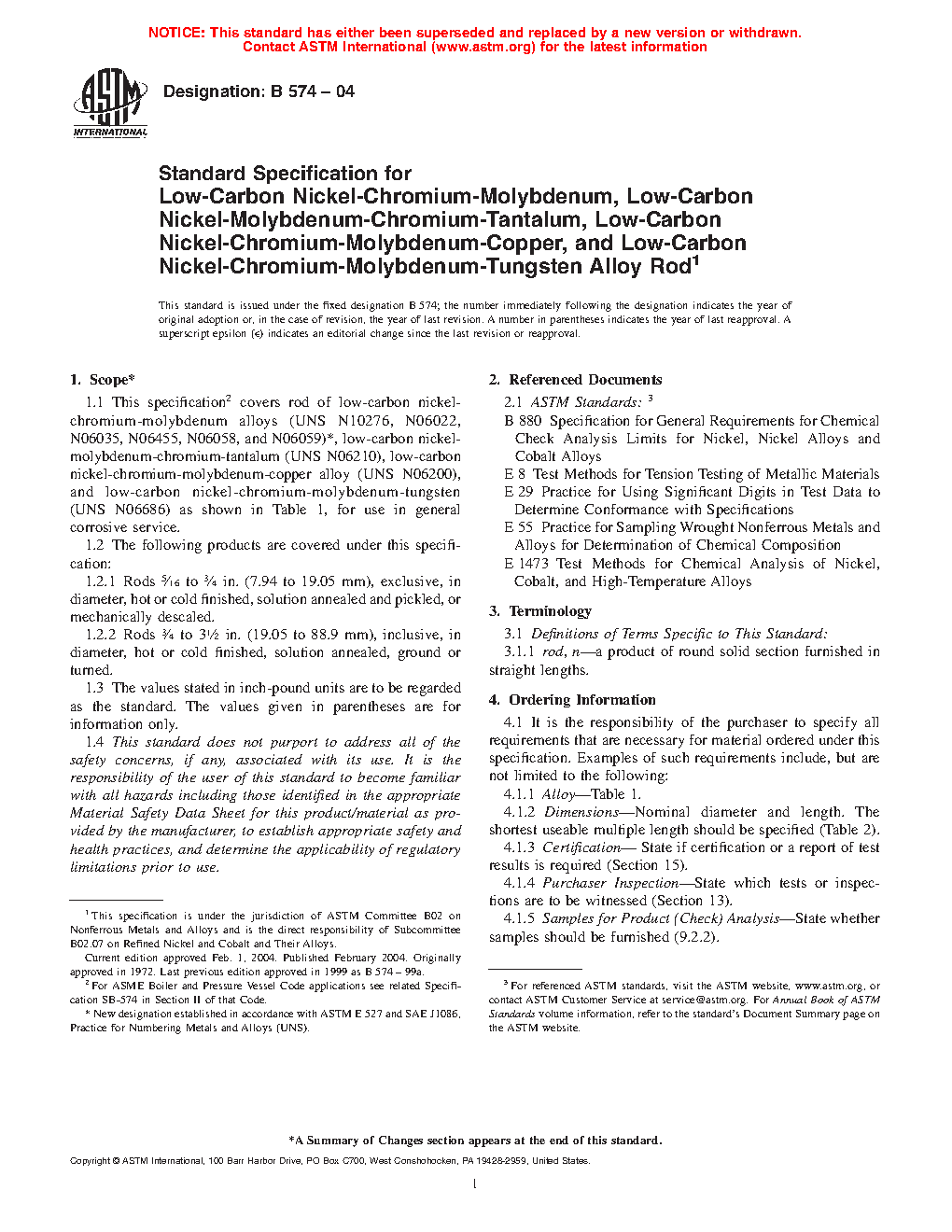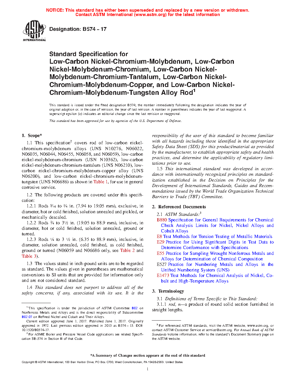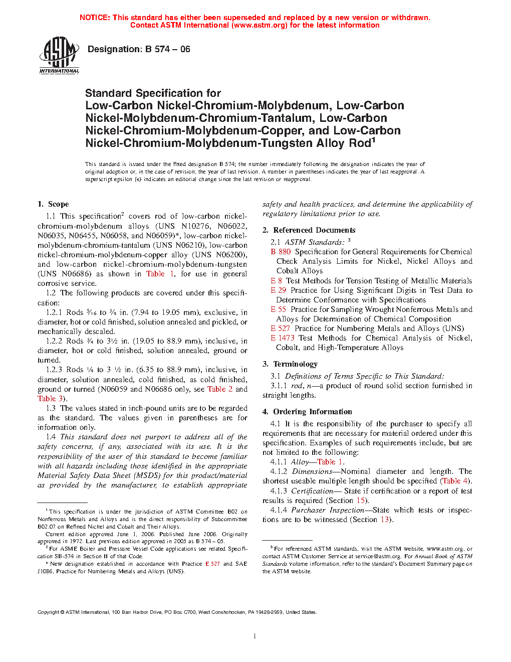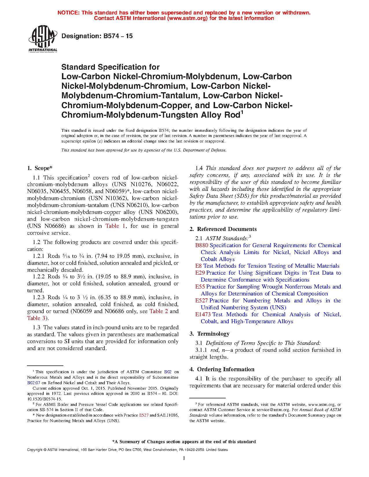 1.1 This specification2 covers rod and bar of low-carbon nickel-chromium-molybdenum alloys (UNS N10276, N06022, N06035, N06044, N06455, N06058, and N06059), low-carbon nickel-molybdenum-chromium (USN N10362), low-carbon nickel-molybdenum-chromium-tantalum (UNS N06210), low-carbon nickel-chromium-molybdenum-copper alloy (UNS N06200), and low-carbon nickel-chromium-molybdenum-tungsten (UNS N06686) as shown in Table 1, for use in general corrosive service.