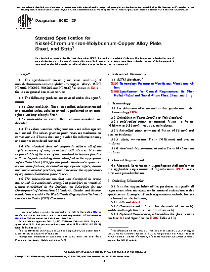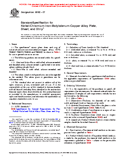 1.1 The specification covers plate, sheet, and strip of nickel-chromium-iron-molybdenum-copper alloys (UNS N06007, N06975, N06985, and N06030)* as shown in Table 1, for use in general corrosive service.