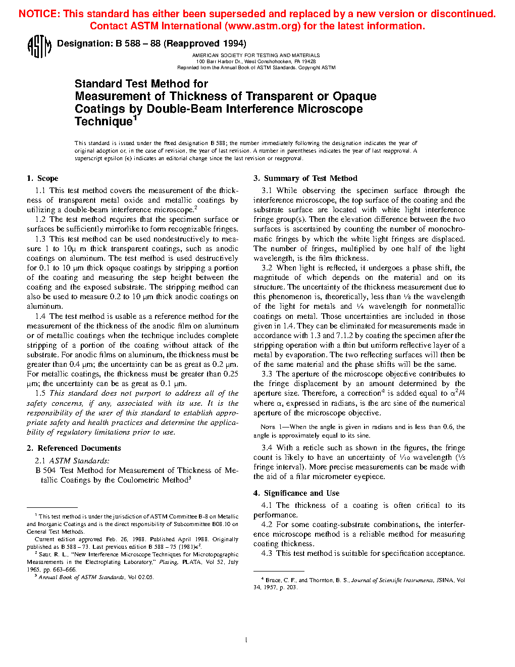 1.3 This test method can be used nondestructively to measure 1 to 10μ m thick transparent coatings, such as anodic coatings on aluminum. The test method is used destructively for 0.1 to 10 μm thick opaque coatings by stripping a portion of the coating and measuring the step height between the coating and the exposed substrate. The stripping method can also be used to measure 0.2 to 10 μm thick anodic coatings on aluminum.