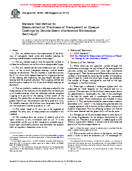 1.1 This test method covers the measurement of the thickness of transparent metal oxide and metallic coatings by utilizing a double-beam interference microscope.