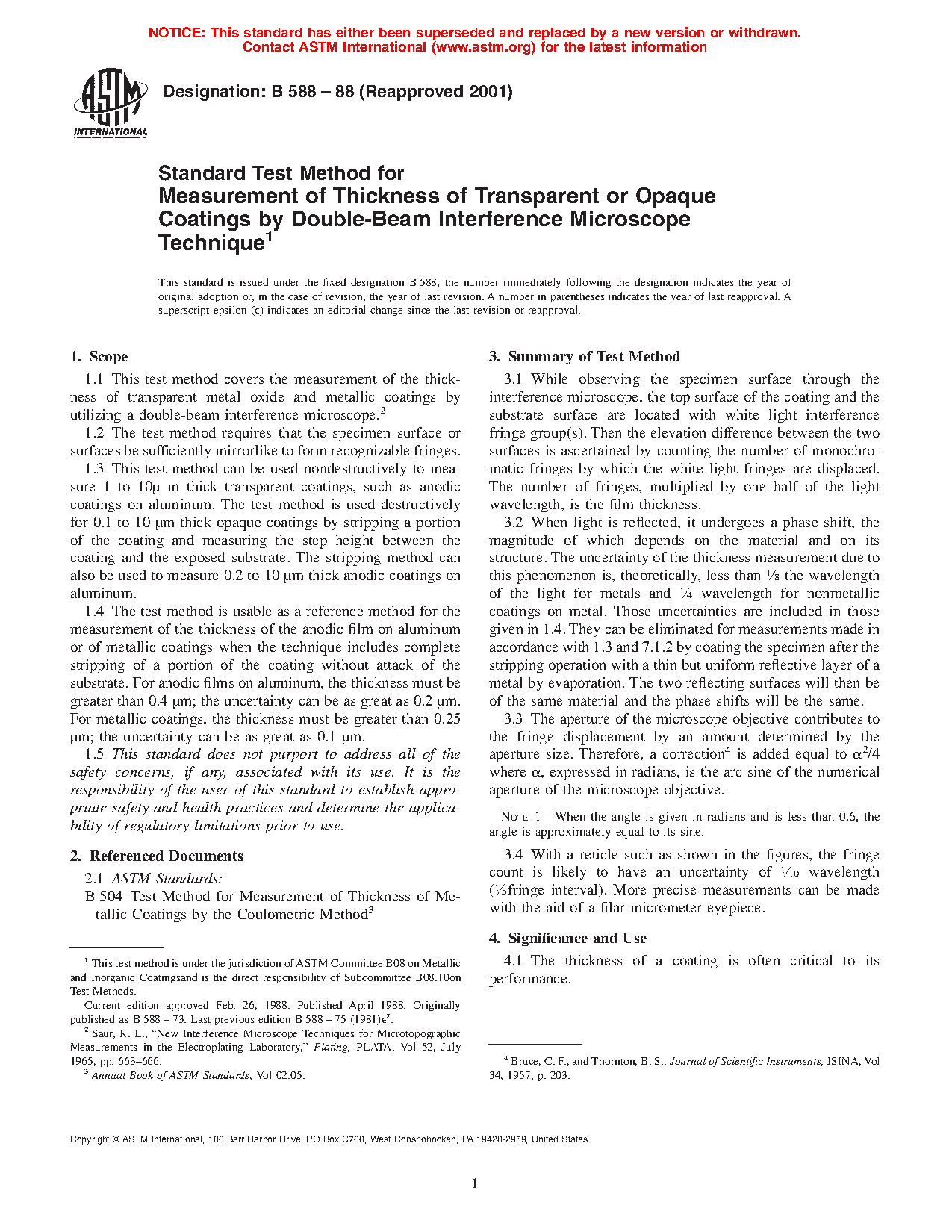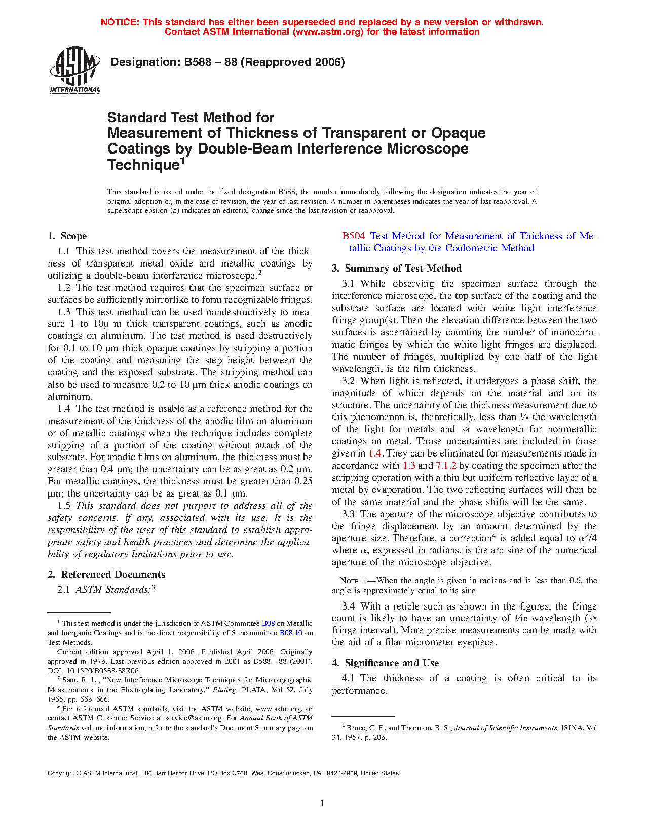 1.3 This test method can be used nondestructively to measure 1 to 10μ m thick transparent coatings, such as anodic coatings on aluminum. The test method is used destructively for 0.1 to 10 μm thick opaque coatings by stripping a portion of the coating and measuring the step height between the coating and the exposed substrate. The stripping method can also be used to measure 0.2 to 10 μm thick anodic coatings on aluminum.