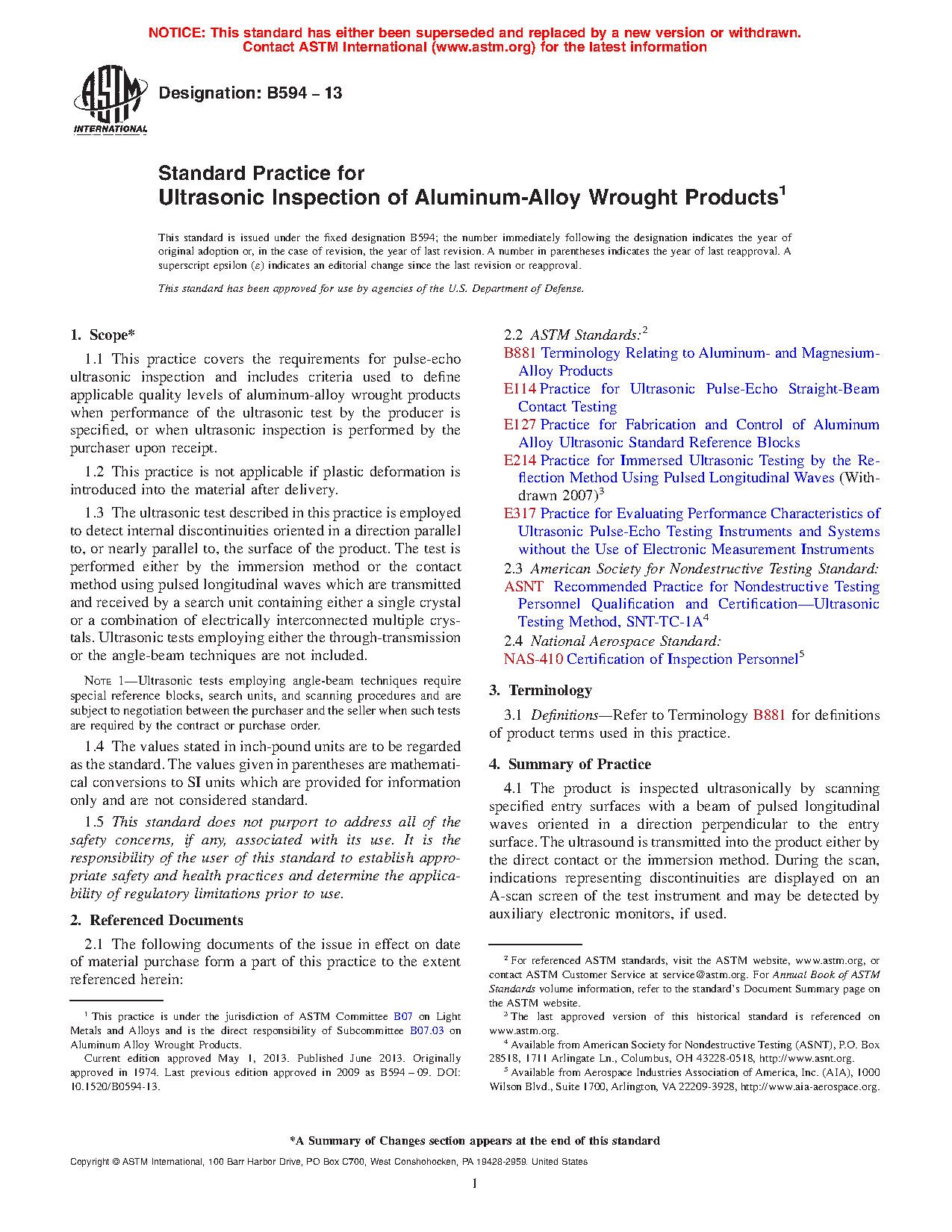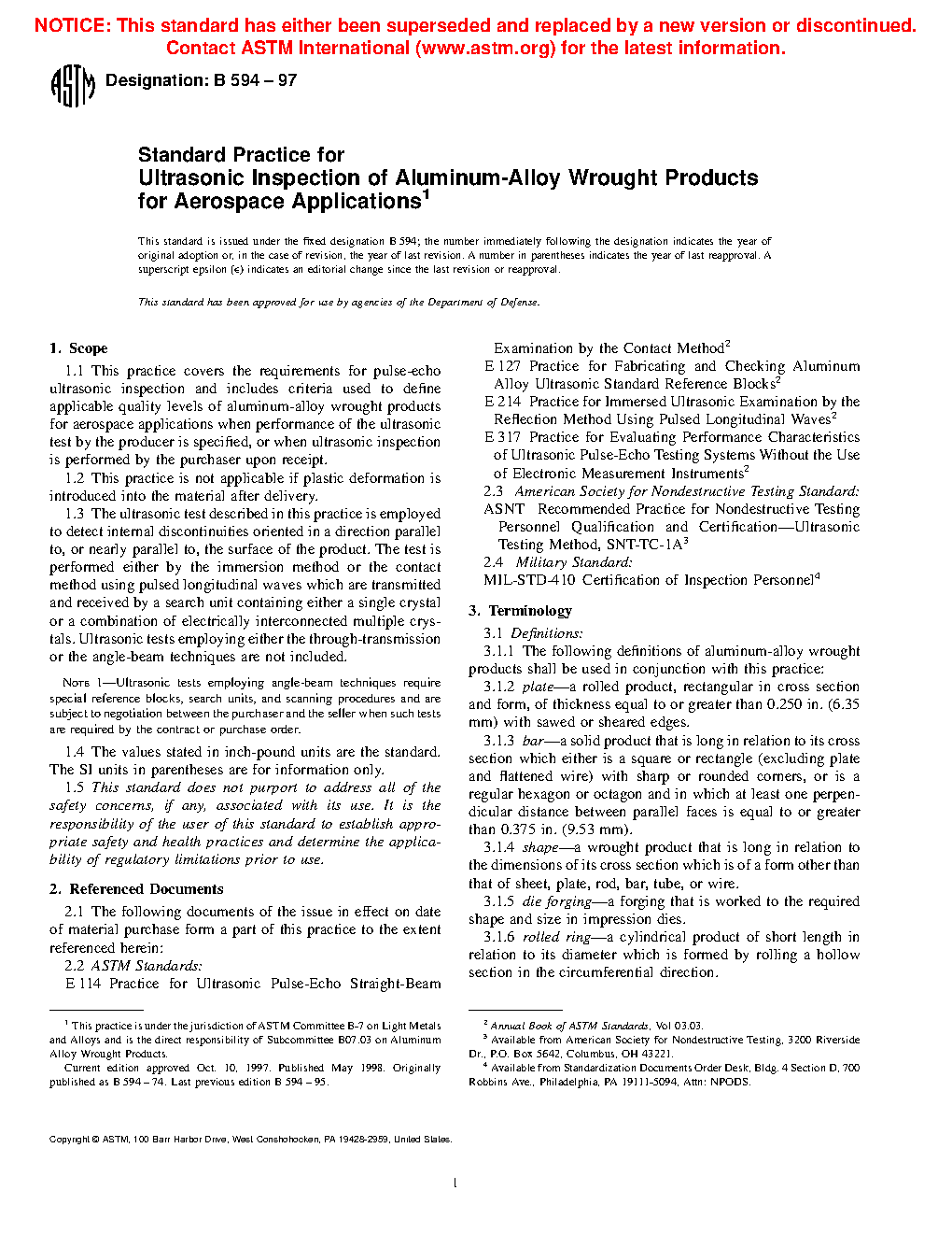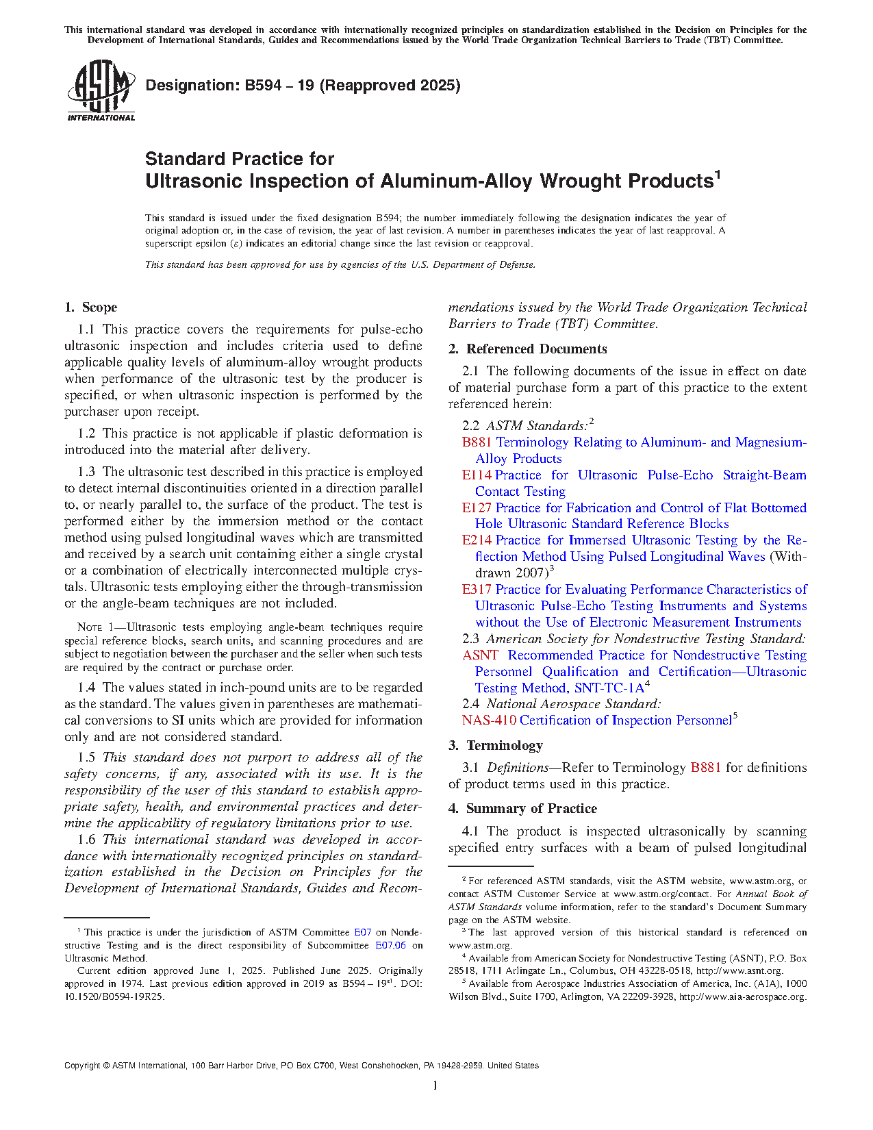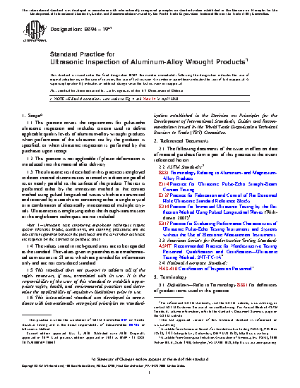 1.1 This practice covers the requirements for pulse-echo ultrasonic inspection and includes criteria used to define applicable quality levels of aluminum-alloy wrought products when performance of the ultrasonic test by the producer is specified, or when ultrasonic inspection is performed by the purchaser upon receipt.