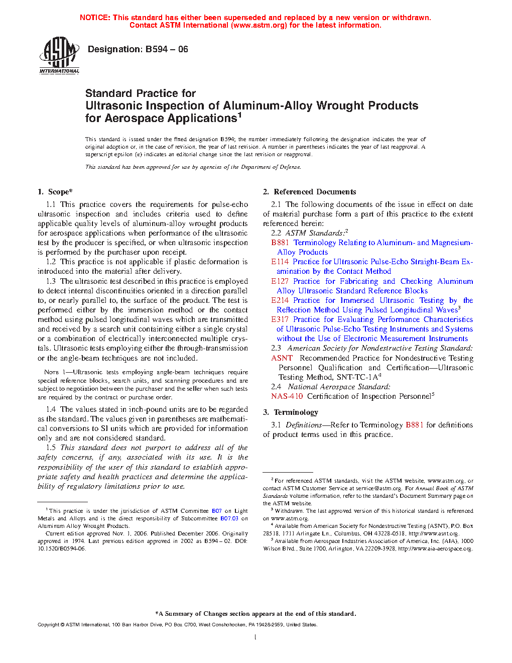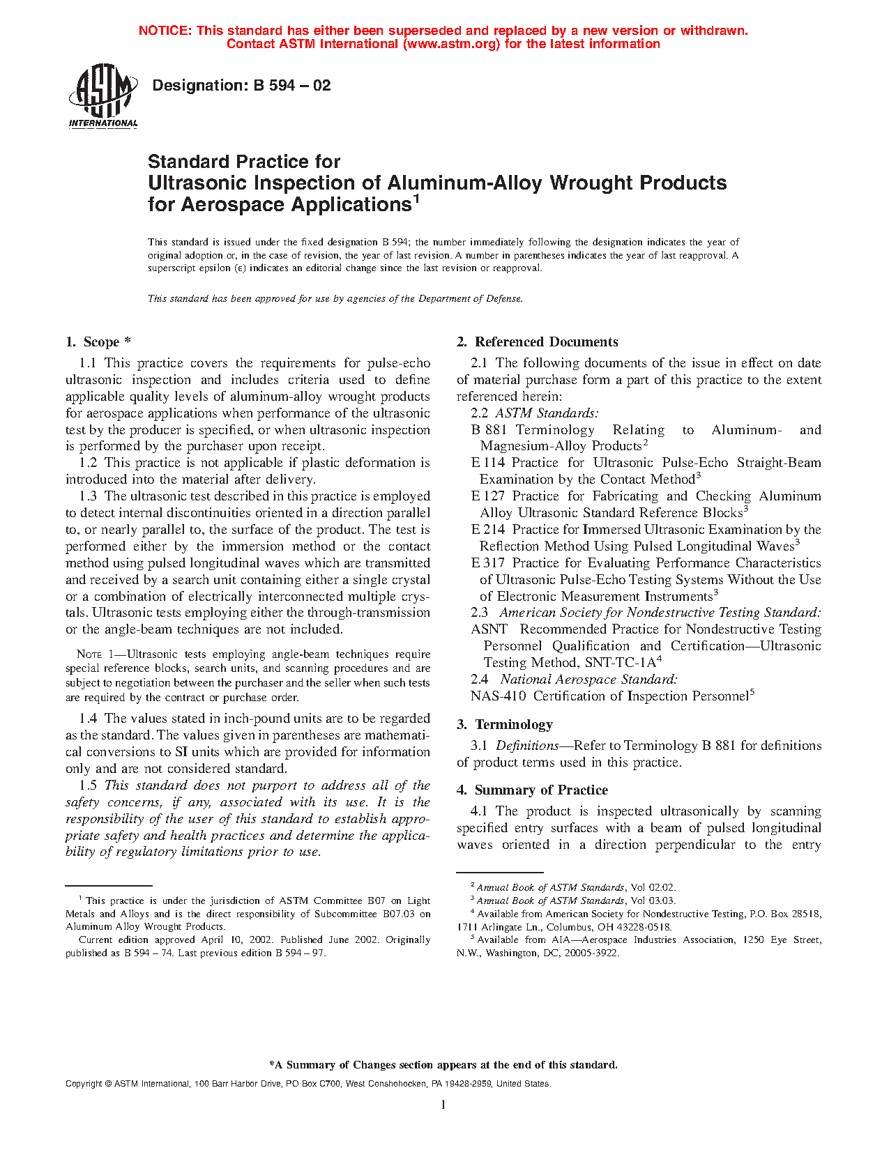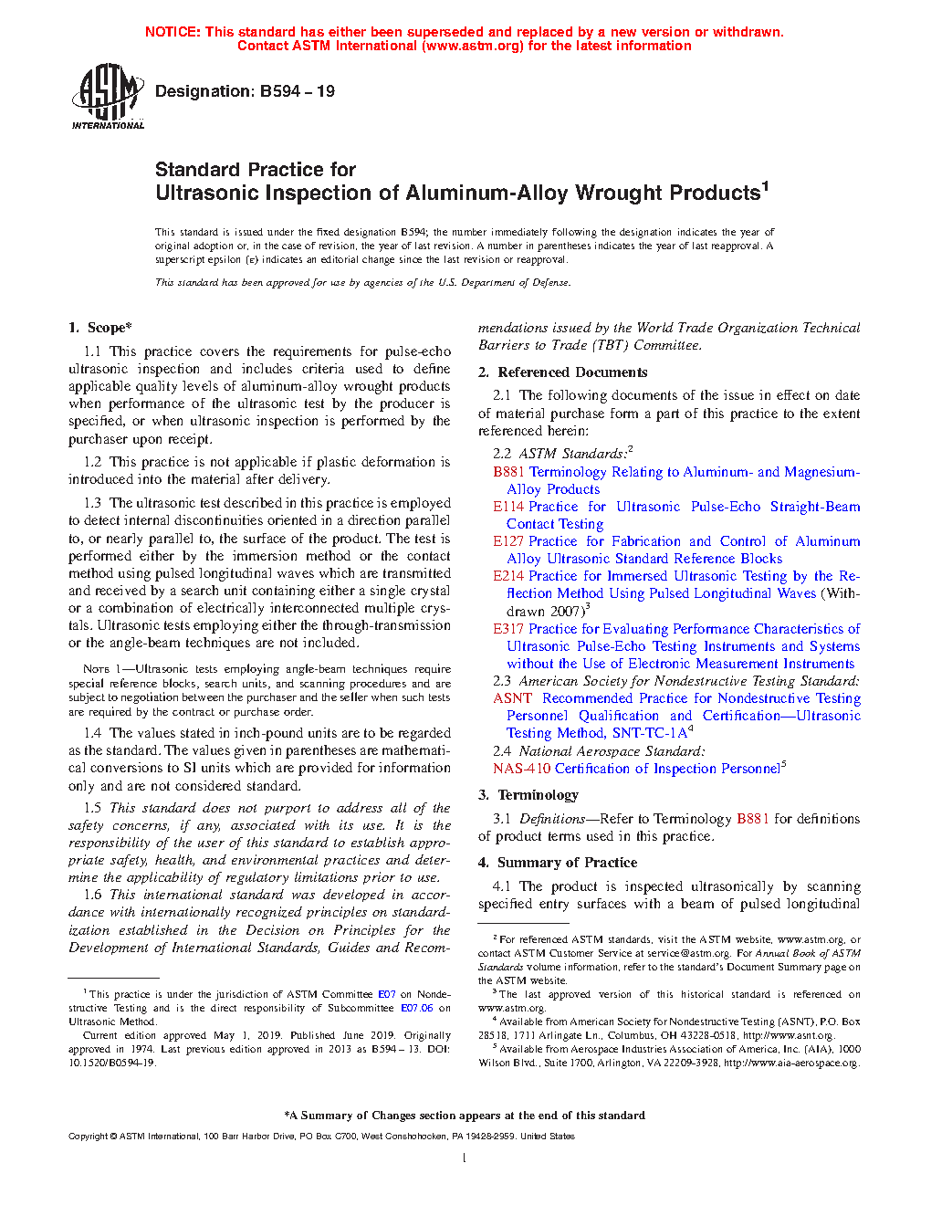 1.1 This practice covers the requirements for pulse-echo ultrasonic inspection and includes criteria used to define applicable quality levels of aluminum-alloy wrought products when performance of the ultrasonic test by the producer is specified, or when ultrasonic inspection is performed by the purchaser upon receipt.