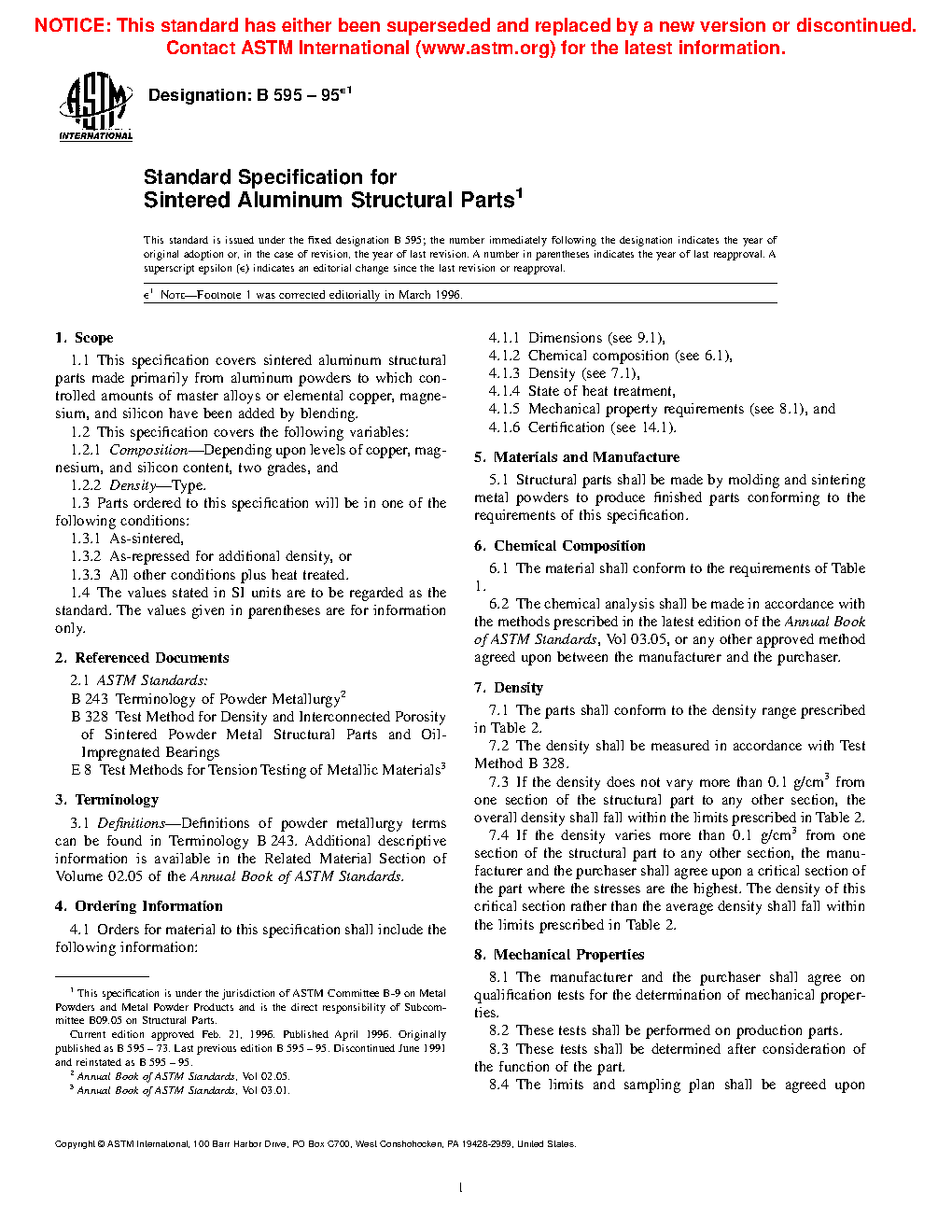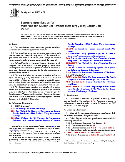 1.1 This specification covers sintered aluminum structural parts made primarily from aluminum powders to which controlled amounts of master alloys or elemental copper, magnesium, and silicon have been added by blending.