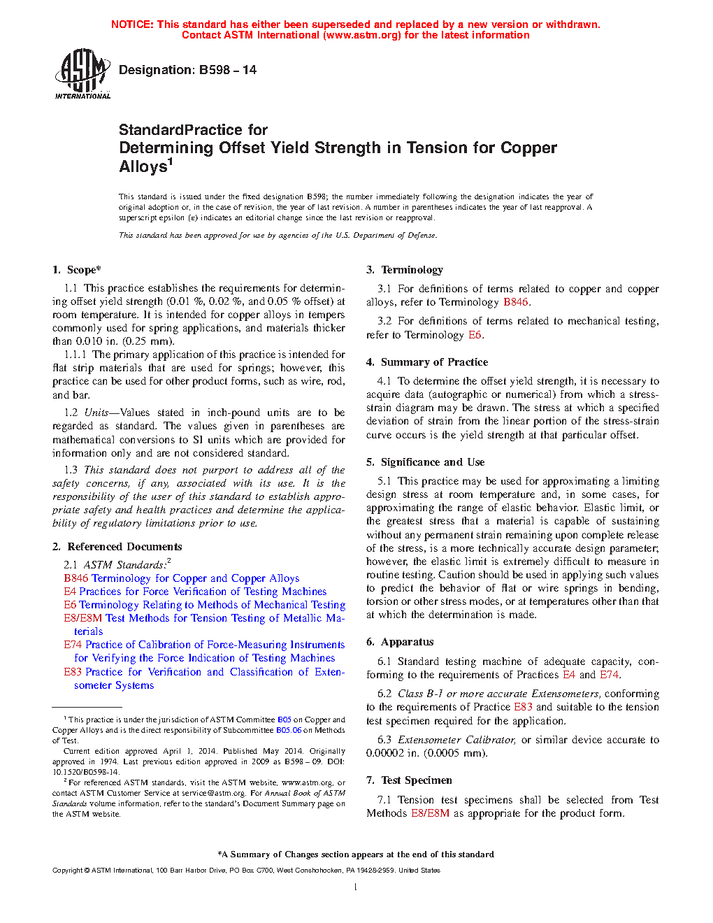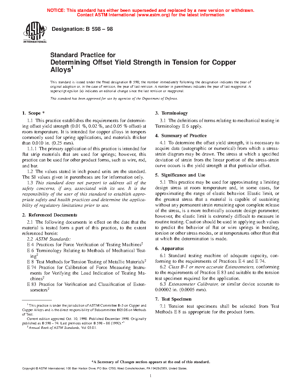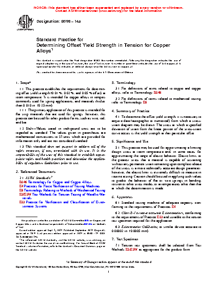 1.1 This practice establishes the requirements for determining offset yield strength (0.01 %, 0.02 %, and 0.05 % offset) at room temperature. It is intended for copper alloys in tempers commonly used for spring applications, and materials thicker than 0.010 in. (0.25 mm).