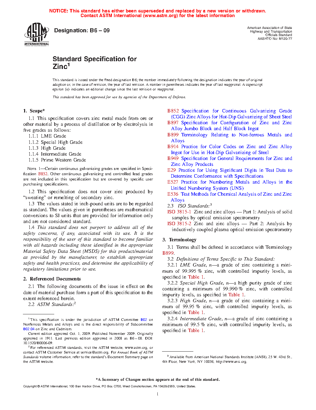 1.1 This specification covers zinc metal made from ore or other material by a process of distillation or by electrolysis in five grades as follows: