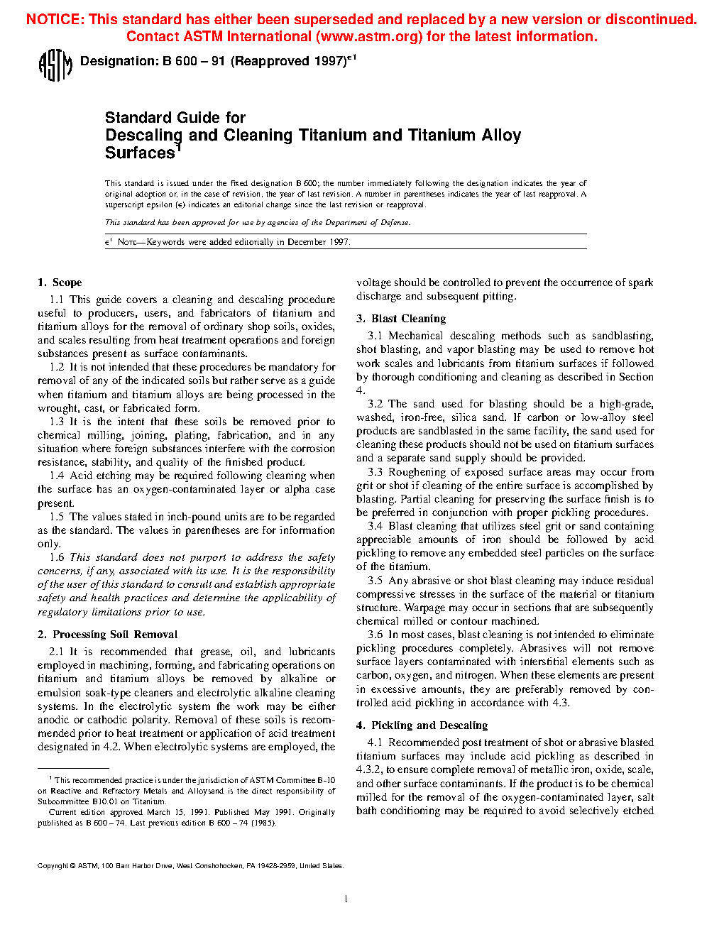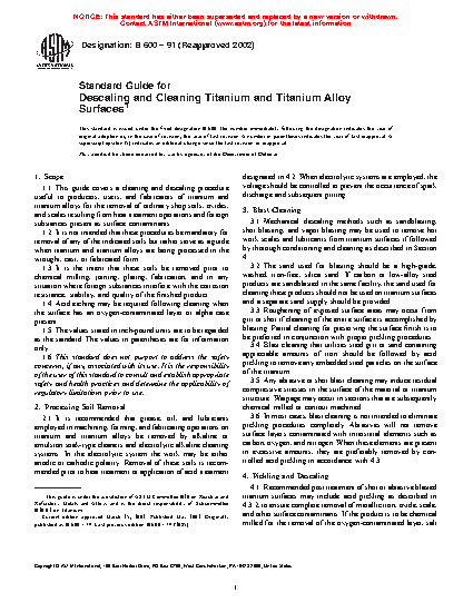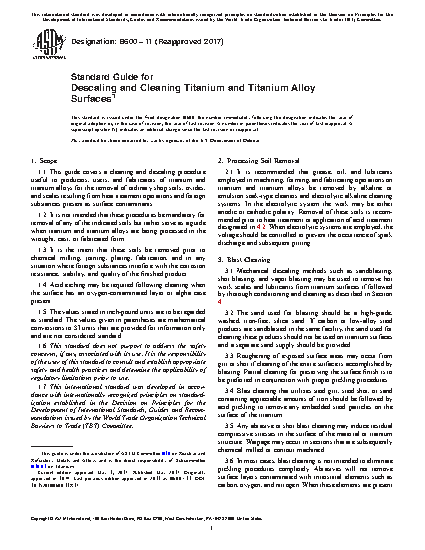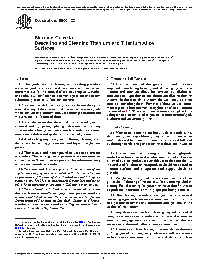 1.1 This guide covers a cleaning and descaling procedure useful to producers, users, and fabricators of titanium and titanium alloys for the removal of ordinary shop soils, oxides, and scales resulting from heat treatment operations and foreign substances present as surface contaminants.
