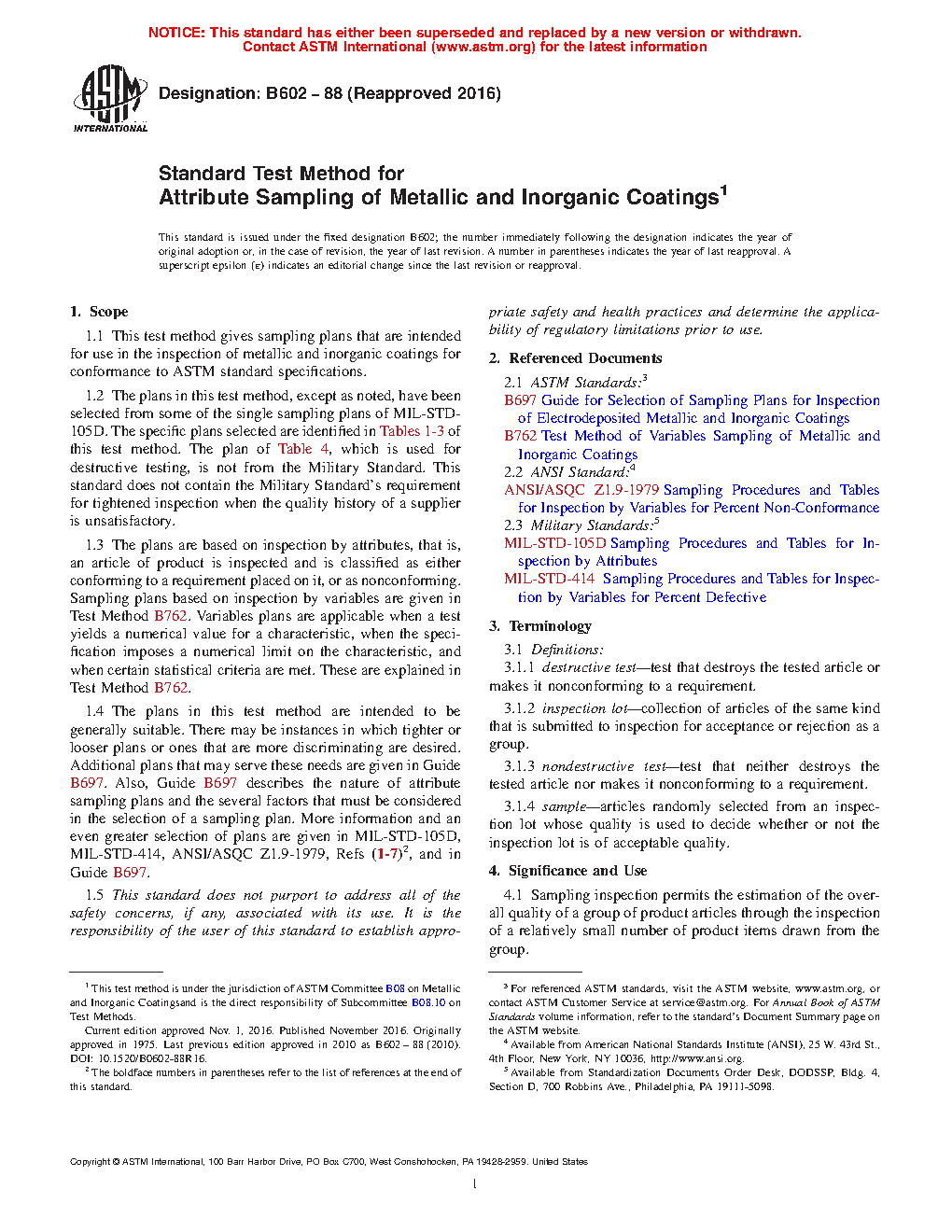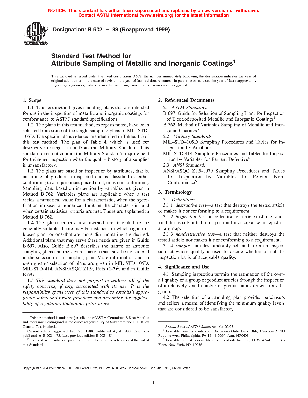 1.2 The plans in this guide, except as noted, have been selected from some of the single sampling plans of MIL-STD-105D. The specific plans selected are identified in Tables 1-3 of this guide. The plan of Table 4, which is used for destructive testing, is not from the Military Standard. This standard does not contain the Military Standard's requirement for tightened inspection when the quality history of a supplier is unsatisfactory.