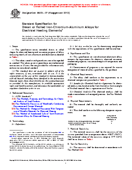 1.1 This specification covers annealed, drawn, or rolled shapes for electrical heating and resistance purposes of alloys consisting mainly of iron, chromium, and aluminum as detailed in Table 1.