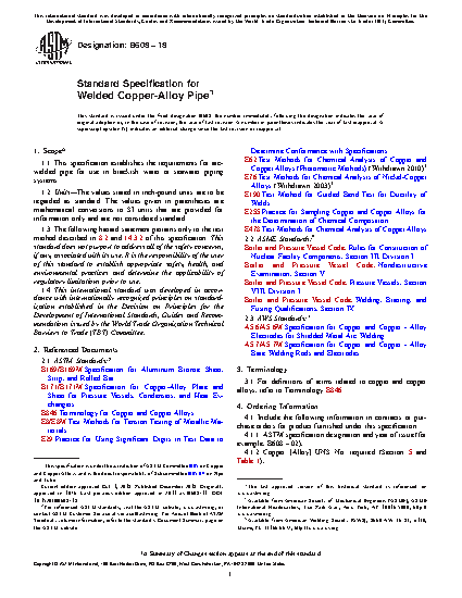 This specification covers arc-welded copper-alloy pipe for use in brackish water or seawater piping systems. The pipe shall be made from annealed copper alloy sheet or plate that conforms to the requirements specified for copper alloys with UNS nos. C61300, C61400 C70620 and C71520. These specifications reference test methods E 62, E 76, and E 478 for the appropriate chemical analysis. Welded joints shall be made either manually or automatically by an arc-welding process. The pipe material shall conform to the chemical composition requirements prescribed. With test taken across any weld, the pipe shall be capable of conforming to the required transverse tensional strength value. The transverse-face and root-guided bend test shall be taken with the weld in the center of the test specimen and there shall be no open defects exceeding the required value measured in any direction on the convex surface of the specimen when tested in accordance with test methods E 190. Each length of pipe shall be capable of withstanding an internal hydrostatic pressure without showing evidence of weakness, defects, or leakage. All welded joints in any individual length of pipe shall be radiographed completely. Weld thickness shall conform to wall-thickness requirements after removal of reinforcement.