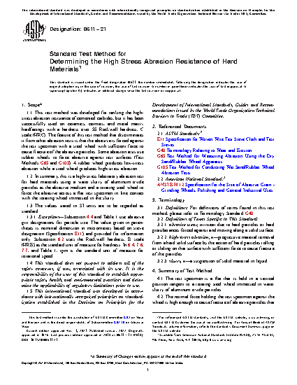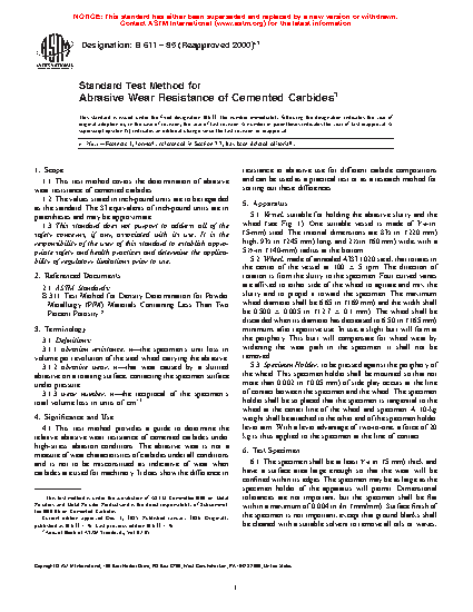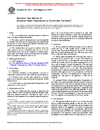 1.1 This test method was developed for ranking the high-stress abrasion resistance of cemented carbides, but it has been successfully used on ceramics, cermets, and metal matrix hardfacings with a hardness over 55 HRC. The feature of this test method that discriminates it from other abrasion tests is that the abrasive is forced against the test specimen with a steel wheel with sufficient force to cause fracture of the abrasive particles. Some abrasion tests use rubber wheels to force abrasive against test surfaces (Test Methods G65, G105, G75). A rubber wheel produces low-stress abrasion while a steel wheel produces high-stress abrasion.