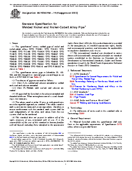 1.1 This specification2 covers welded pipe of nickel and nickel-cobalt alloys (UNS N10001; UNS N10242; UNS N10665; UNS N12160; UNS N10624; UNS N10629; UNS N10675; UNS N10276; UNS N06455; UNS N06007; UNS N06975; UNS N08320; UNS N06002; UNS N06022; UNS N06035; UNS N06044; UNS N06058; UNS N06059; UNS N06200; UNS N10362; UNS N06985; UNS N06030; UNS R30556; UNS N08031; UNS N06230; UNS N06686; UNS N06210; and UNS R20033)3 as shown in Table 1.