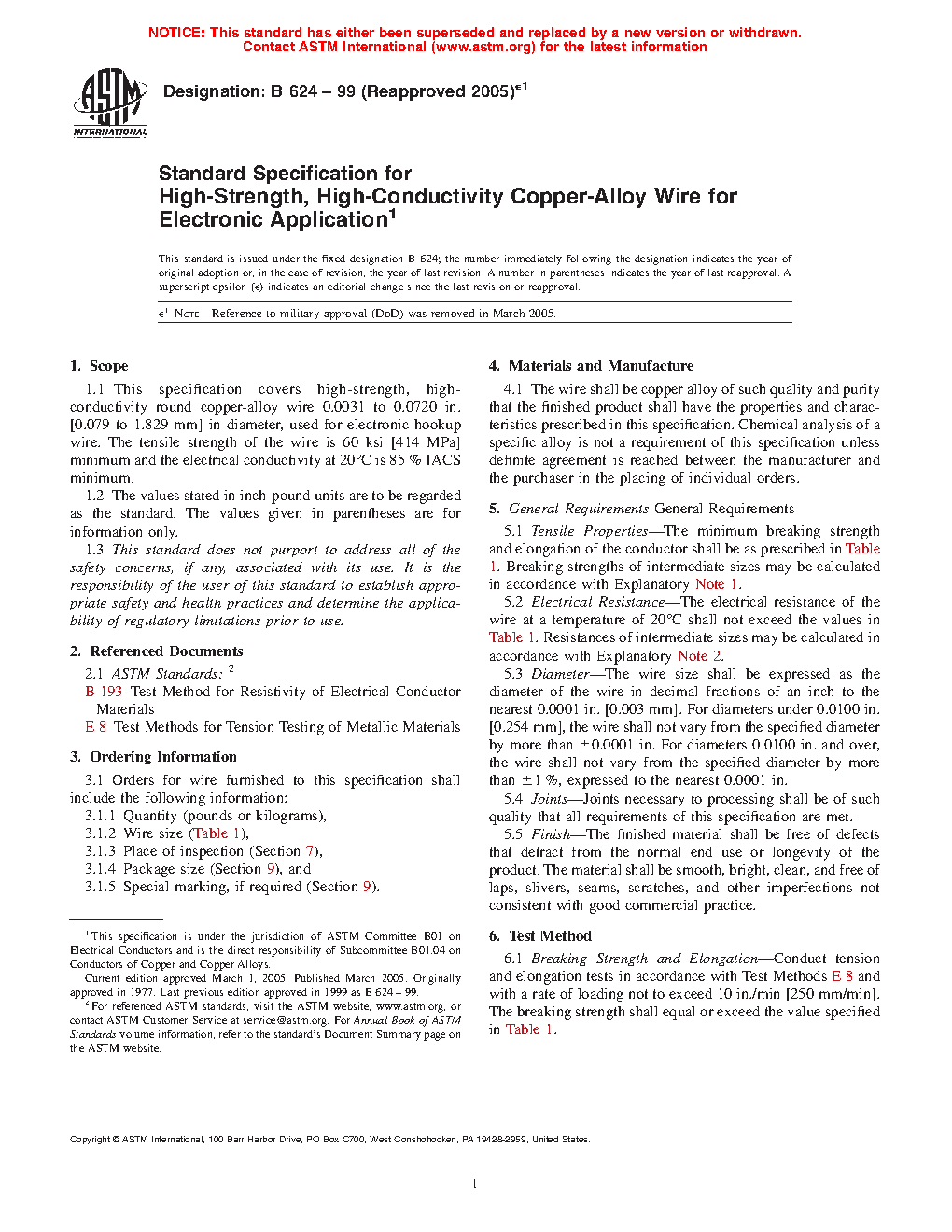 This specification covers high-strength, high conductivity round copper-alloy wire used for electronic hook-up wire. The wires shall conform to the required minimum breaking strength and elongation. Electrical resistance and diameter of the wire shall be measured. The finished material shall be free of defects that detract from the normal end use or longevity of the product. Joints necessary to processing shall be of such quality that all requirements are met.