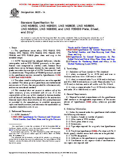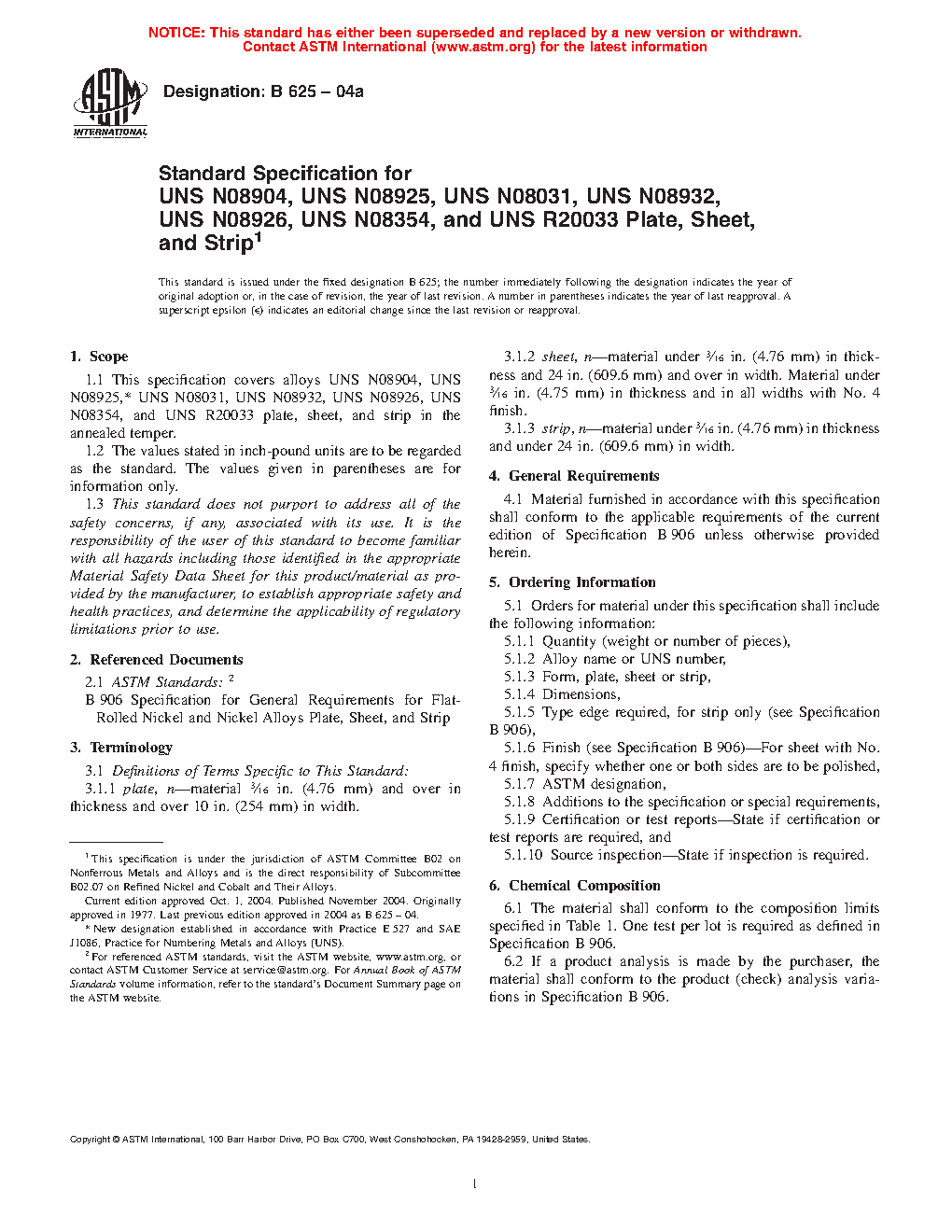 1.2 ASTM International has adopted definitions whereby some grades, such as UNS N08904, previously in this specification were recognized as stainless steels, because those grades have iron as the largest element by mass percent. Such grades are under the oversight of ASTM Committee A01 and its subcommittees. The products of N08904 previously covered in this specification are now covered by Specifications A240/A240M and A480/A480M.