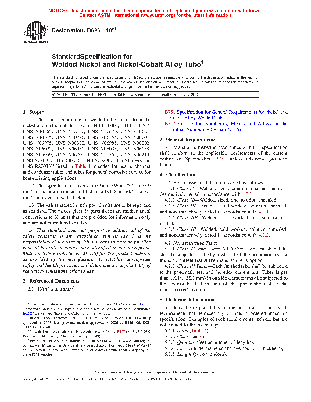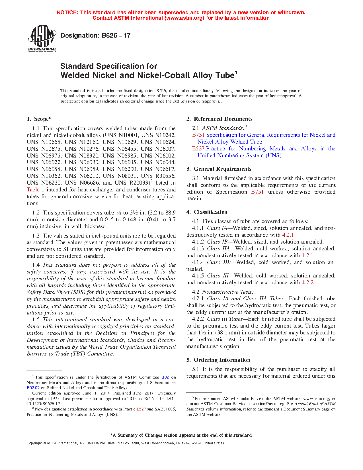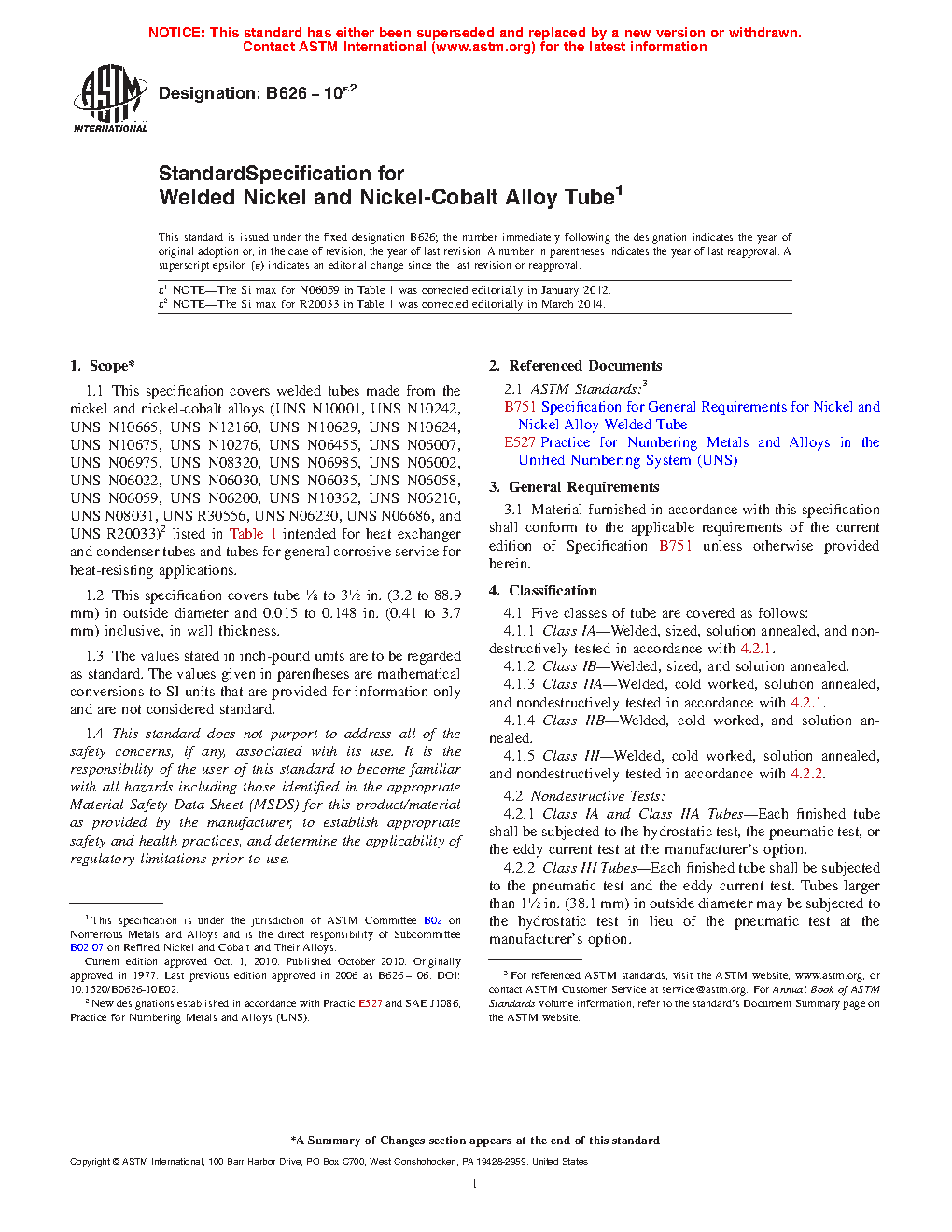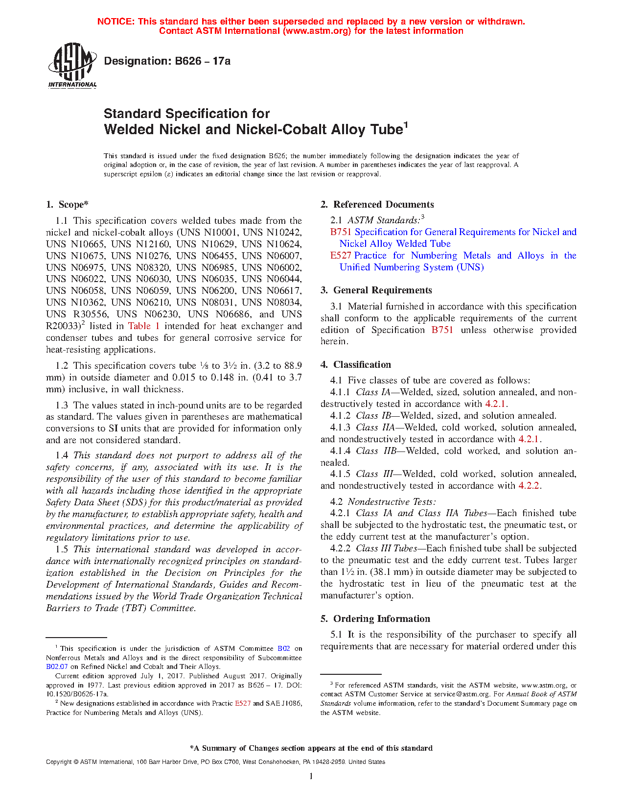 1.1 This specification covers welded tubes made from the nickel and nickel-cobalt alloys (UNS N10001, UNS N10242, UNS N10665, UNS N12160, UNS N10629, UNS N10624, UNS N10675, UNS N10276, UNS N06455, UNS N06007, UNS N06975, UNS N08320, UNS N06985, UNS N06002, UNS N06022, UNS N06030, UNS N06035, UNS N06044, UNS N06058, UNS N06059, UNS N06200, UNS N06617, UNS N10362, UNS N06210, UNS N08031, UNS N08034, UNS R30556, UNS N06230, UNS N06686, UNS N06235 and UNS R20033)2 listed in Table 1 intended for heat exchanger and condenser tubes and tubes for general corrosive service for heat-resisting applications.