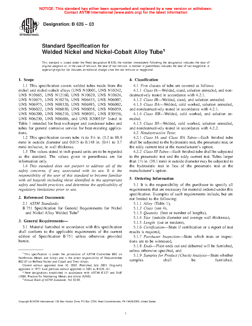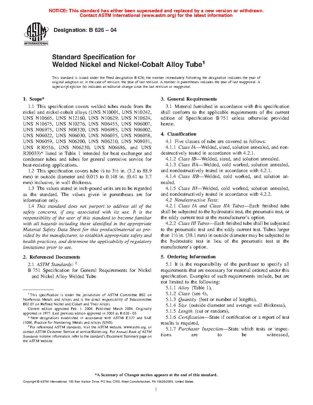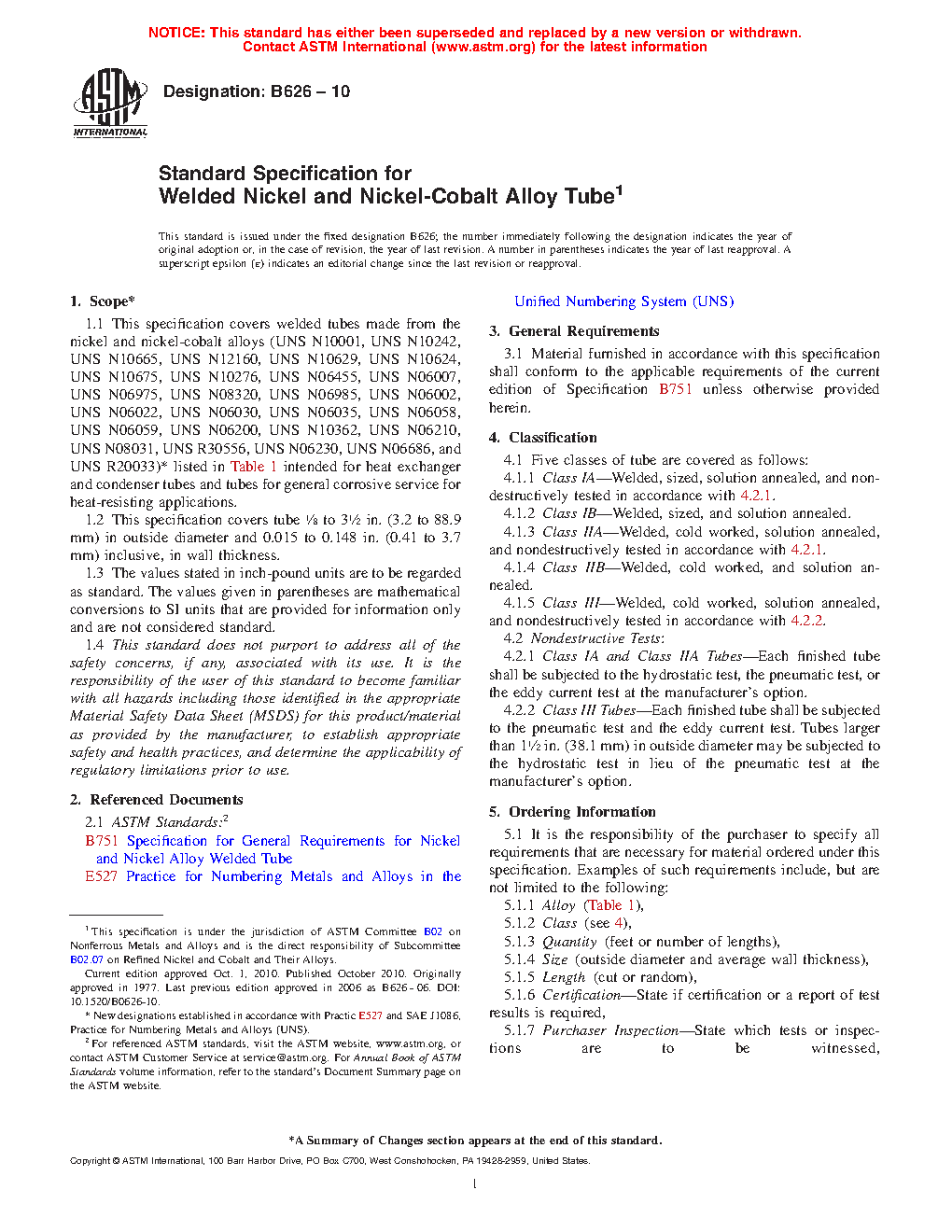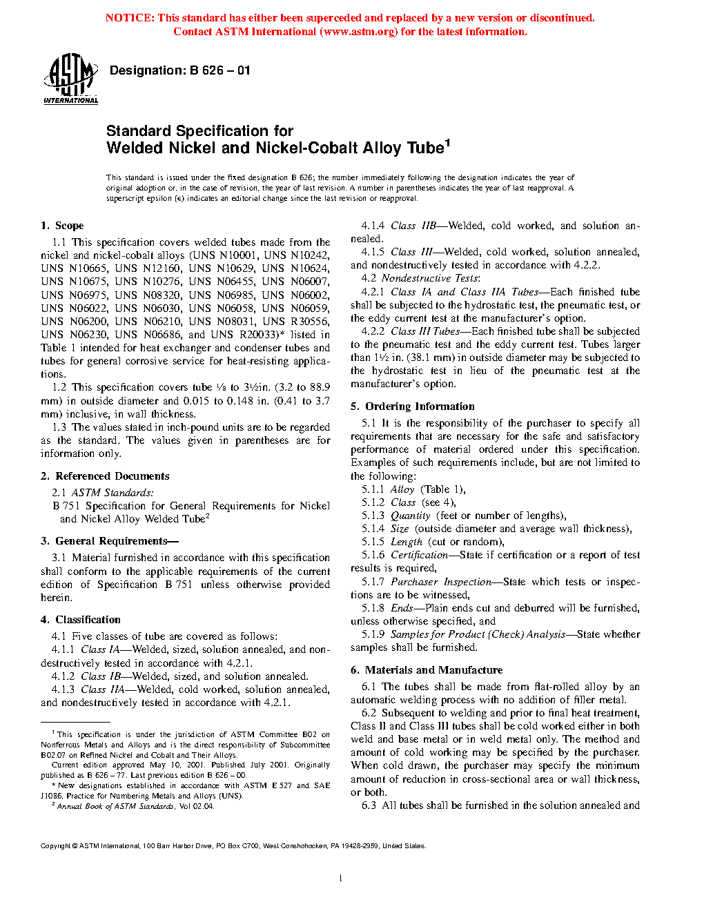 1.1 This specification covers welded tubes made from the nickel and nickel-cobalt alloys (UNS N10001, UNS N10242, UNS N10665, UNS N12160, UNS N10629, UNS N10624, UNS N10675, UNS N10276, UNS N06455, UNS N06007, UNS N06975, UNS N08320, UNS N06985, UNS N06002, UNS N06022, UNS N06030, UNS N06035, UNS N06044, UNS N06058, UNS N06059, UNS N06200, UNS N06617, UNS N10362, UNS N06210, UNS N08031, UNS N08034, UNS R30556, UNS N06230, UNS N06686, UNS N06235 and UNS R20033)2 listed in Table 1 intended for heat exchanger and condenser tubes and tubes for general corrosive service for heat-resisting applications.