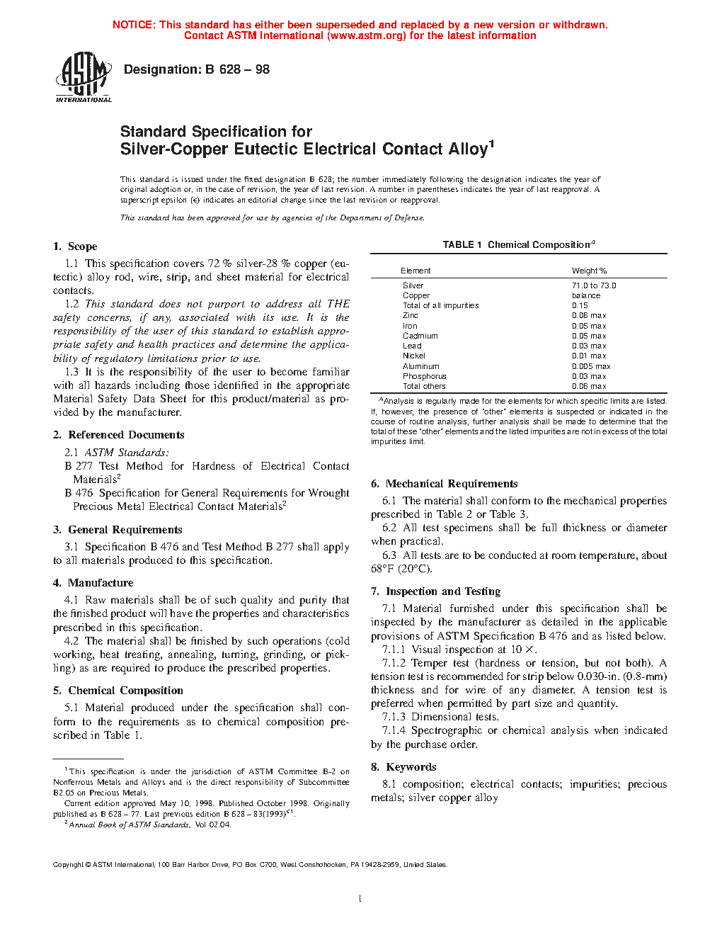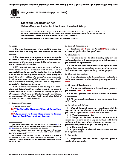1.1 This specification covers 72% silver-28% copper (eutectic) alloy rod, wire, strip, and sheet material for electrical contacts.