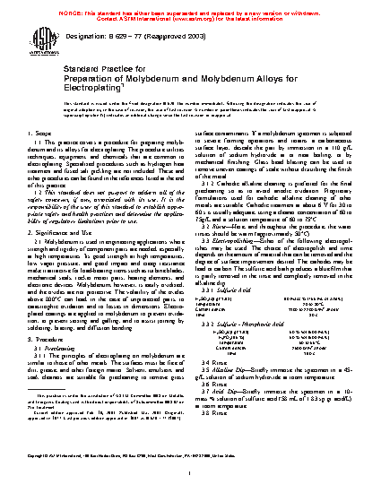 1.1 This practice covers a procedure for preparing molybdenum and its alloys for electroplating. The procedure utilizes techniques, equipment, and chemicals that are common to electroplating. Specialized procedures such as hydrogen heat treatment and fused salt pickling are not included. These and other procedures can be found in the references listed at the end of this practice.