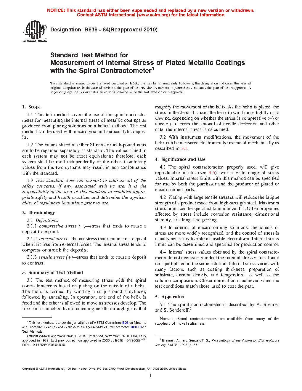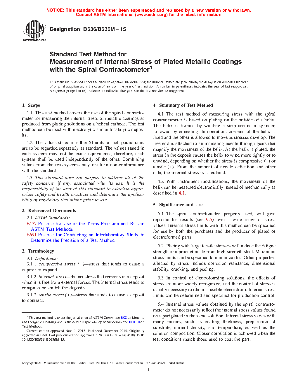 5.1 The spiral contractometer, properly used, will give reproducible results (see 9.5) over a wide range of stress values. Internal stress limits with this method can be specified for use by both the purchaser and the producer of plated or electroformed parts.