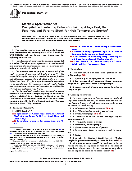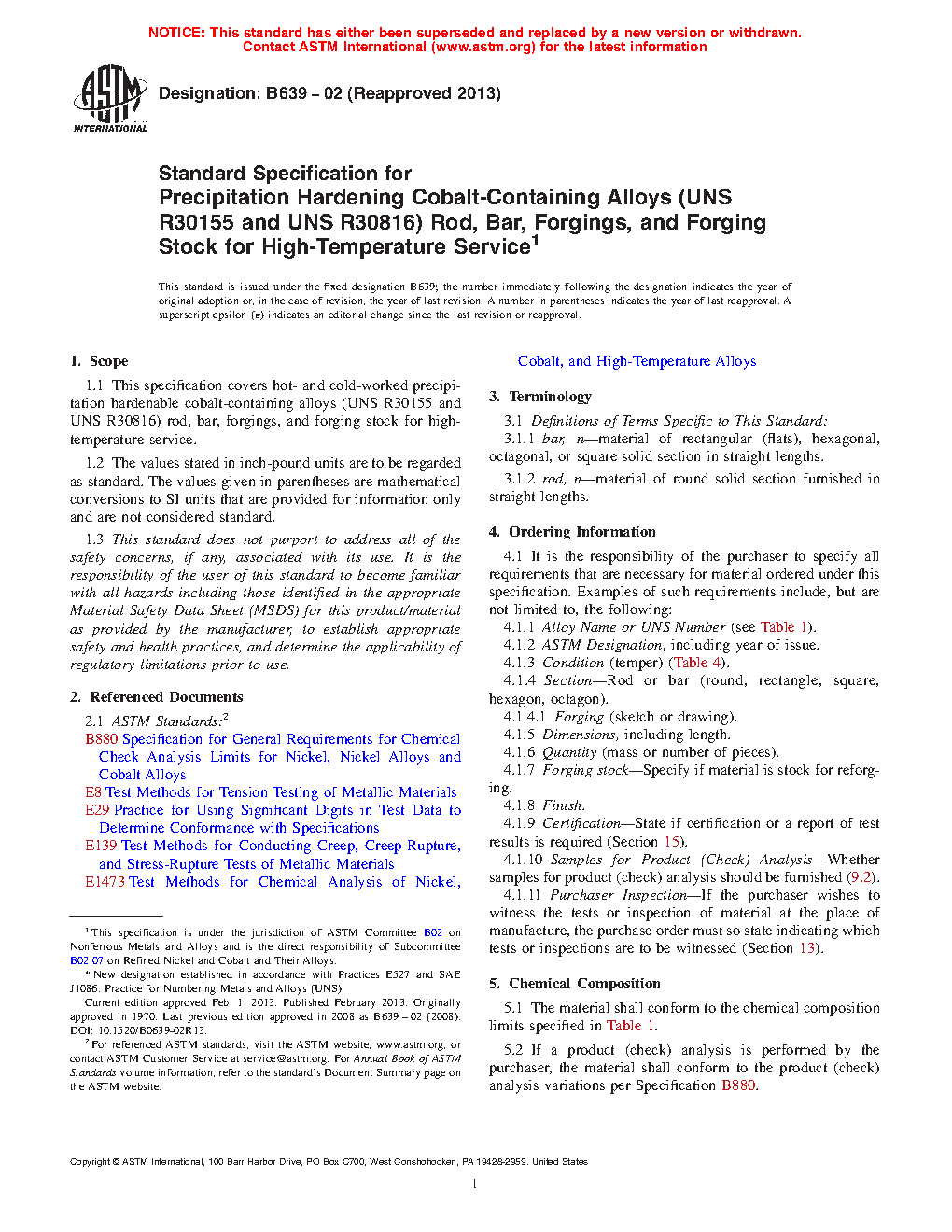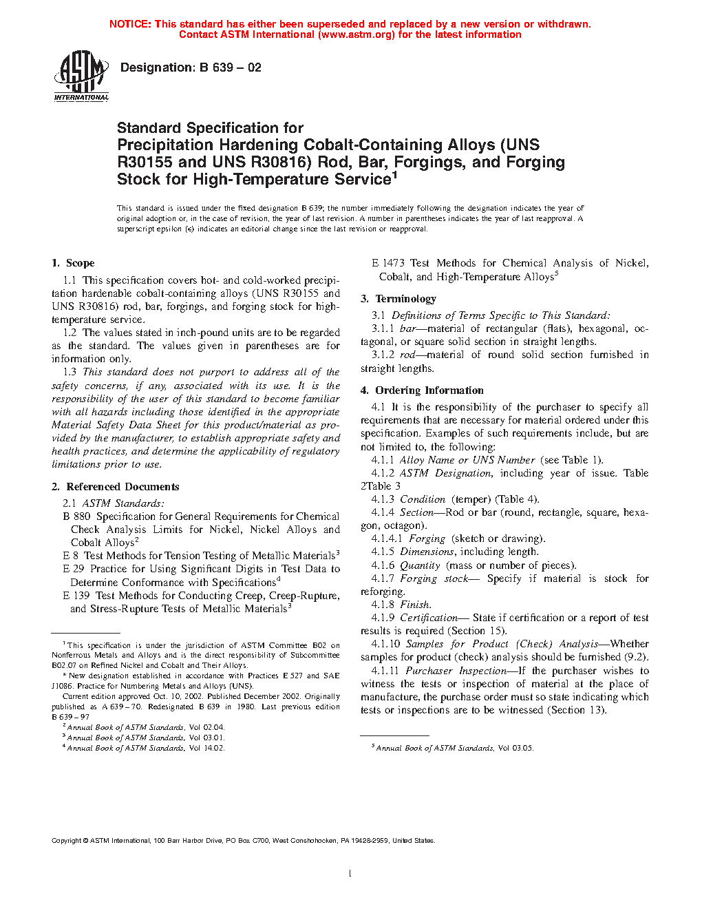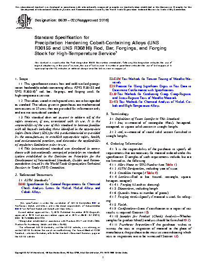 1.1 This specification covers hot- and cold-worked precipitation hardenable cobalt-containing alloys (UNS R30155 and UNS R30816) rod, bar, forgings, and forging stock for high-temperature service.