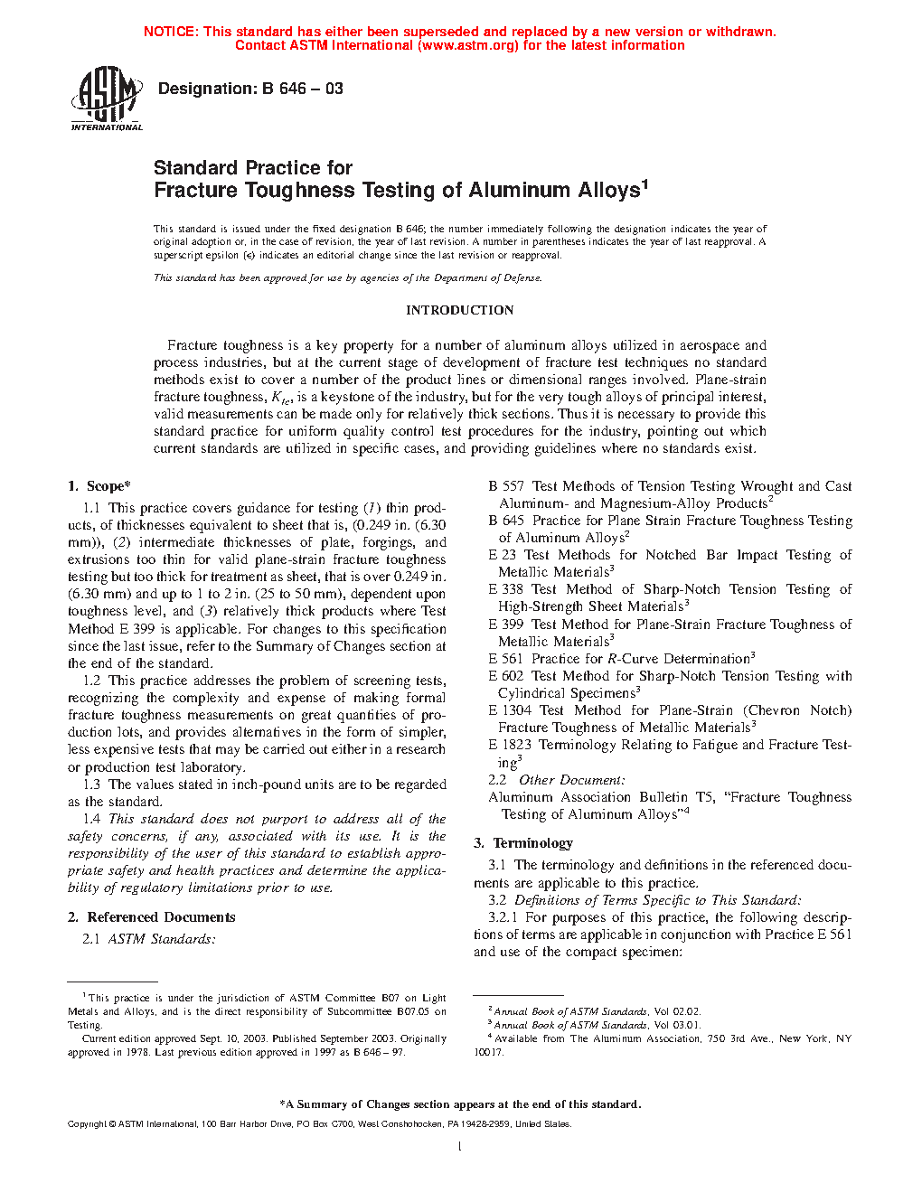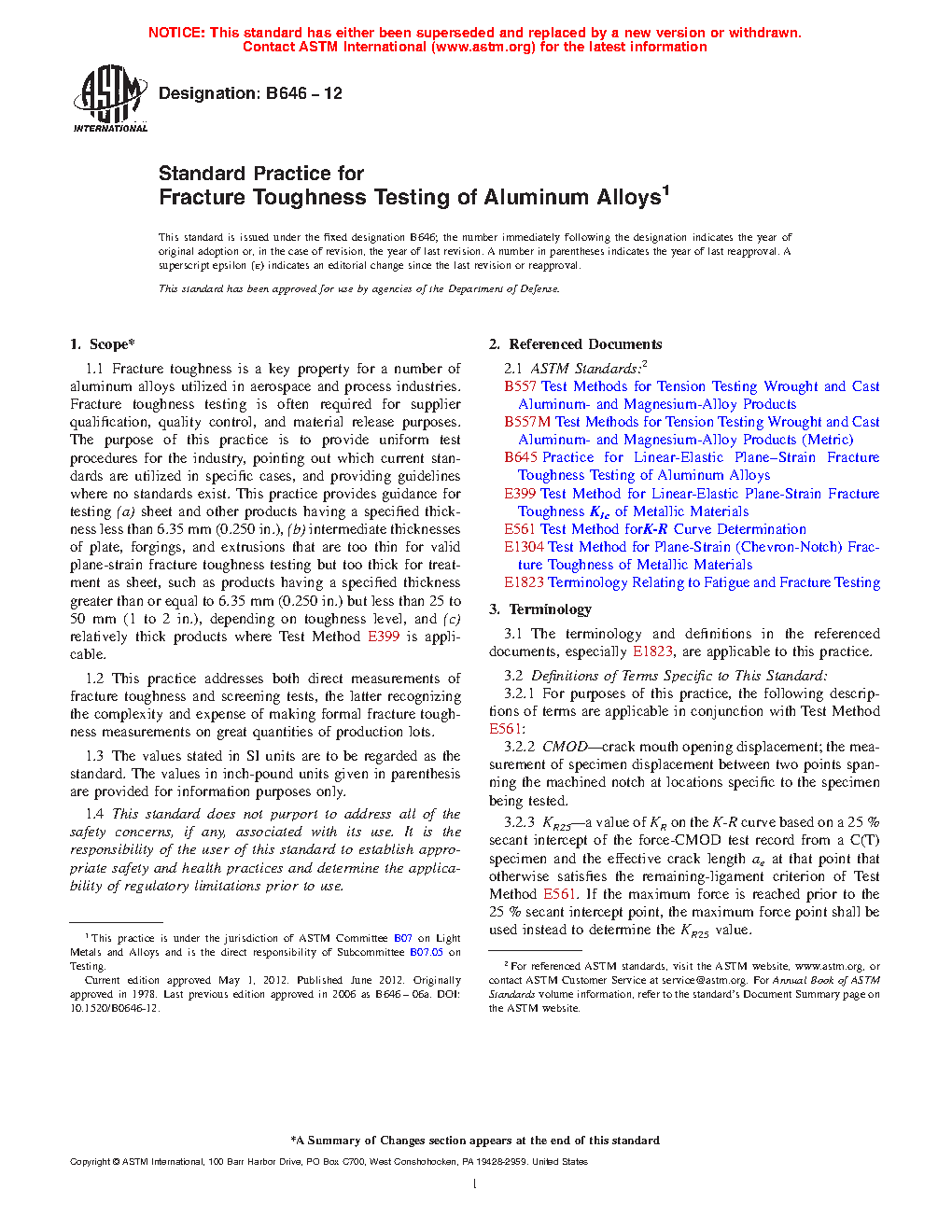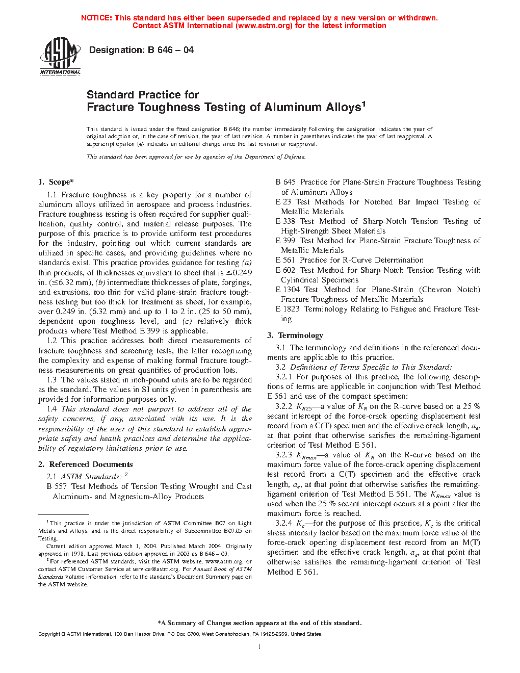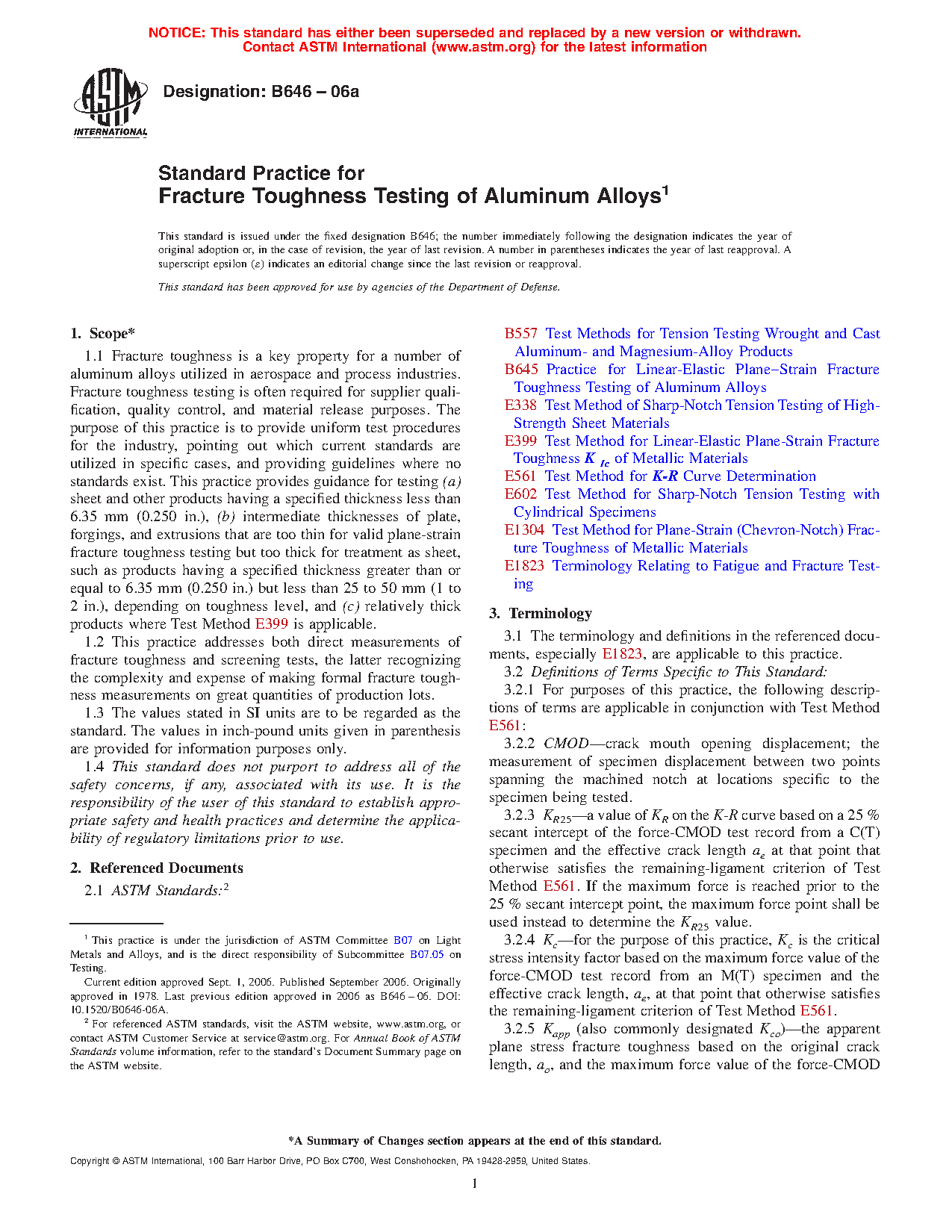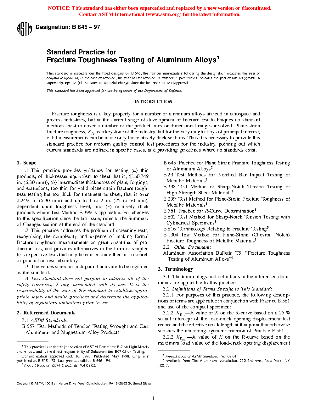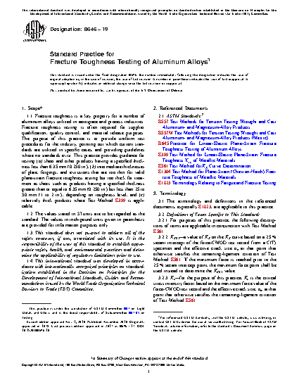 1.1 Fracture toughness is a key property for a number of aluminum alloys utilized in aerospace and process industries. Fracture toughness testing is often required for supplier qualification, quality control, and material release purposes. The purpose of this practice is to provide uniform test procedures for the industry, pointing out which current standards are utilized in specific cases, and providing guidelines where no standards exist. This practice provides guidance for testing (a) sheet and other products having a specified thickness less than 6.35 mm (0.250 in.), (b) intermediate thicknesses of plate, forgings, and extrusions that are too thin for valid plane-strain fracture toughness testing but too thick for treatment as sheet, such as products having a specified thickness greater than or equal to 6.35 mm (0.250 in.) but less than 25 to 50 mm (1 to 2 in.), depending on toughness level, and (c) relatively thick products where Test Method E399 is applicable.