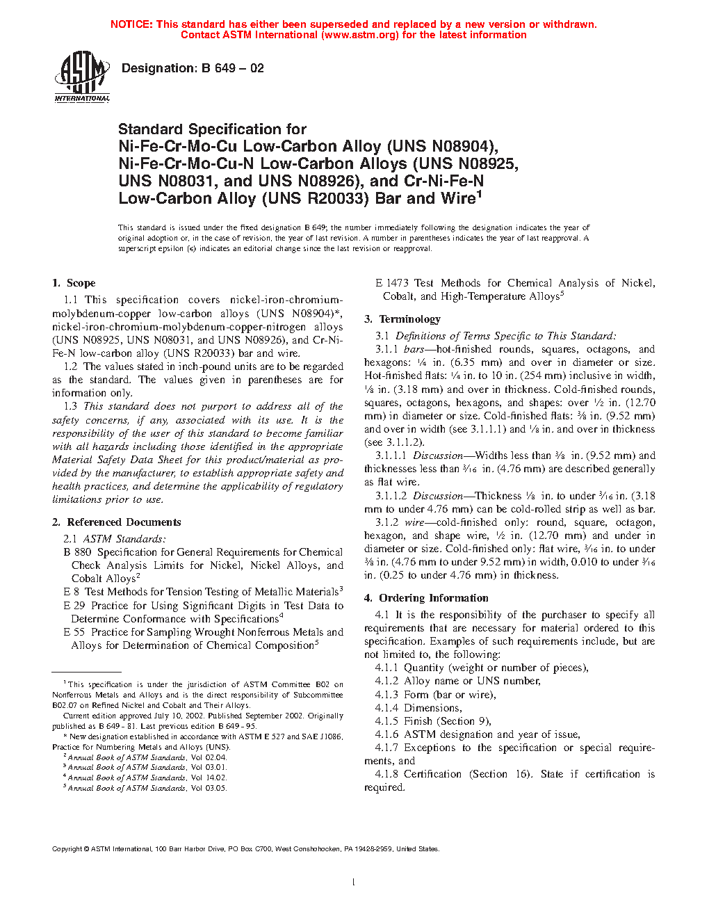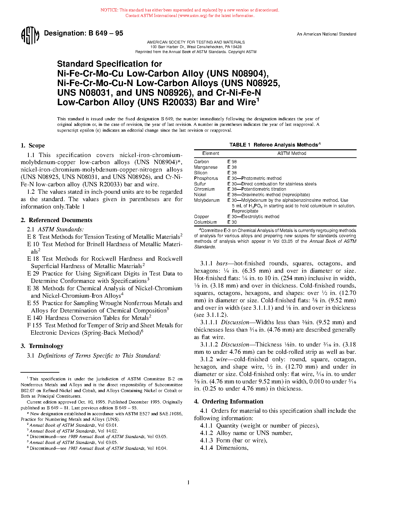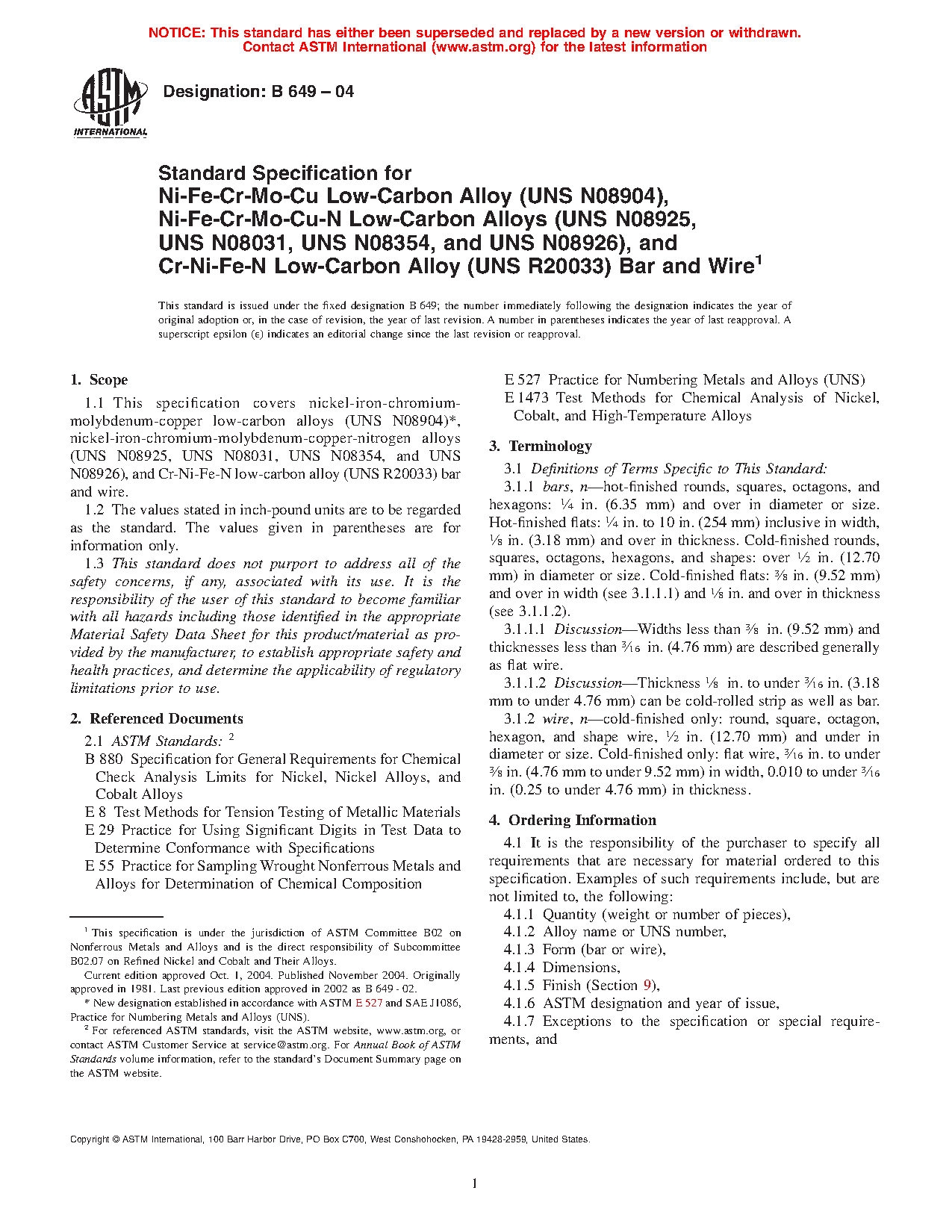 1.2 ASTM International has adopted definitions whereby some grades, such as UNS N08904,2 previously in this specification were recognized as stainless steels, because those grades have iron as the largest element by mass percent. Such grades are under the oversight of ASTM Committee A01 and its subcommittees. The products of N08904 previously covered in this specification are now covered by Specifications A479/A479M and A484/A484M.
