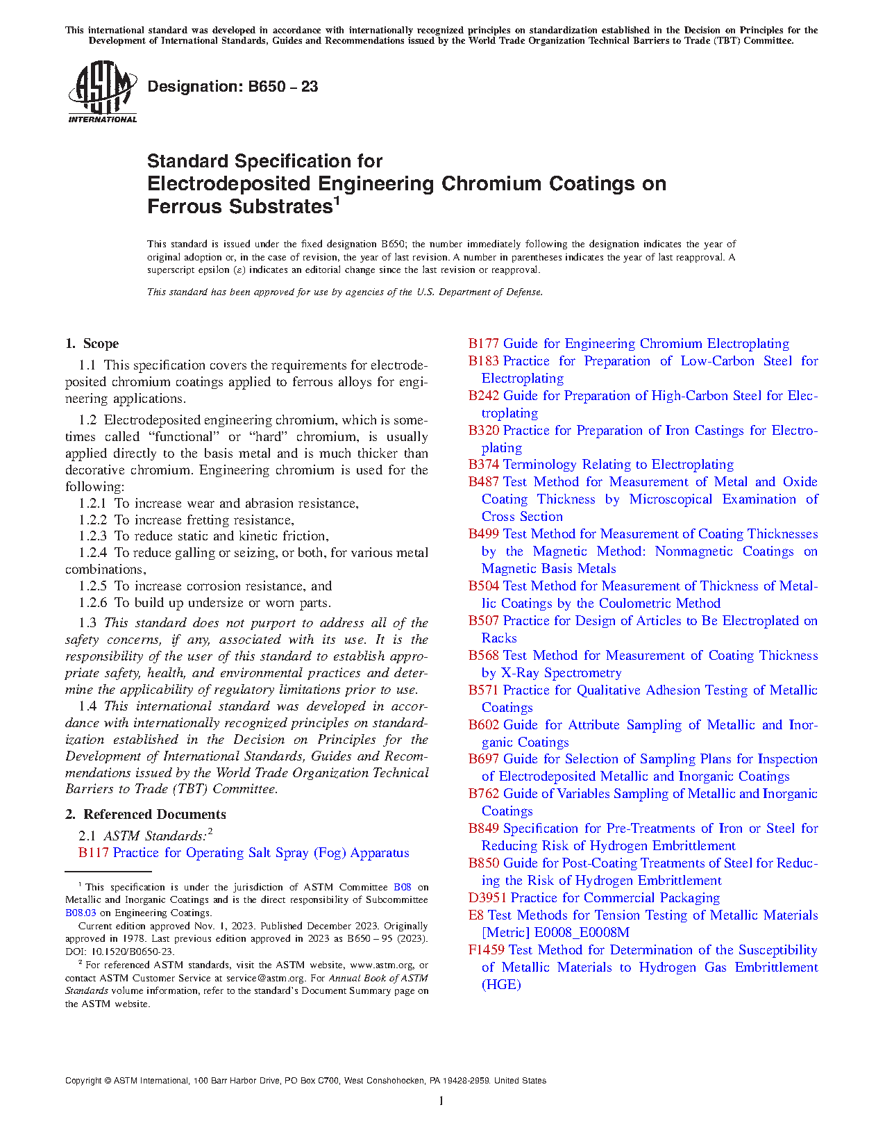 This specification covers the requirements for electrodeposited chromium coatings (sometimes referred to as functional or hard chromium) applied to ferrous alloy substrates for engineering applications, particularly for increasing wear, abrasion, fretting, and corrosion resistance; for reducing galling or seizing, and static and kinetic friction; and for building up undersize or worn parts. Coatings shall be classified according to their thickness. Coatings shall be sampled, tested, and shall conform accordingly to specified requirements as to appearance, stress relief and hydrogen embrittlement treatment, thickness (to measured either by microscopical, magnetic, coulometric, or X-ray spectrometry method), adhesion (to be assessed either by bend, file, heat and quench, or push test), porosity (to be examined either by ferroxyl, neutral salt spray, or copper sulfate test), workmanship, and packaging.