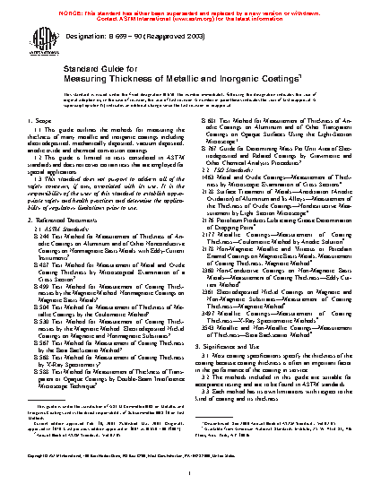 1.1 This guide outlines the methods for measuring the thickness of many metallic and inorganic coatings including electrodeposited, mechanically deposited, vacuum deposited, anodic oxide and chemical conversion coatings.