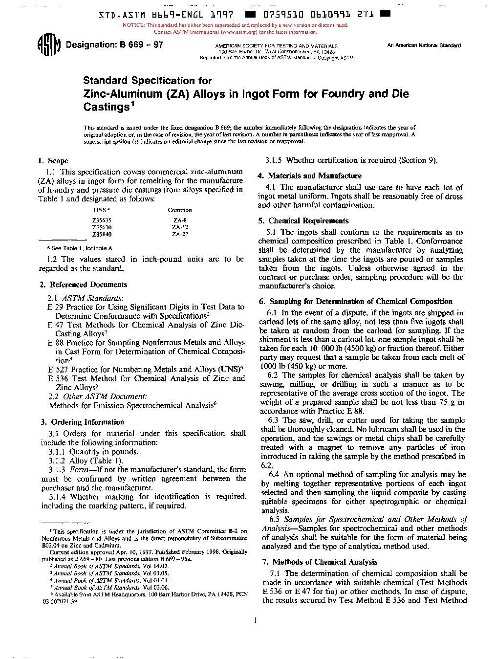 Specification for Zinc-Aluminum (ZA) Alloys in Ingot Form for Foundry and Die Castings (Withdrawn 1999)