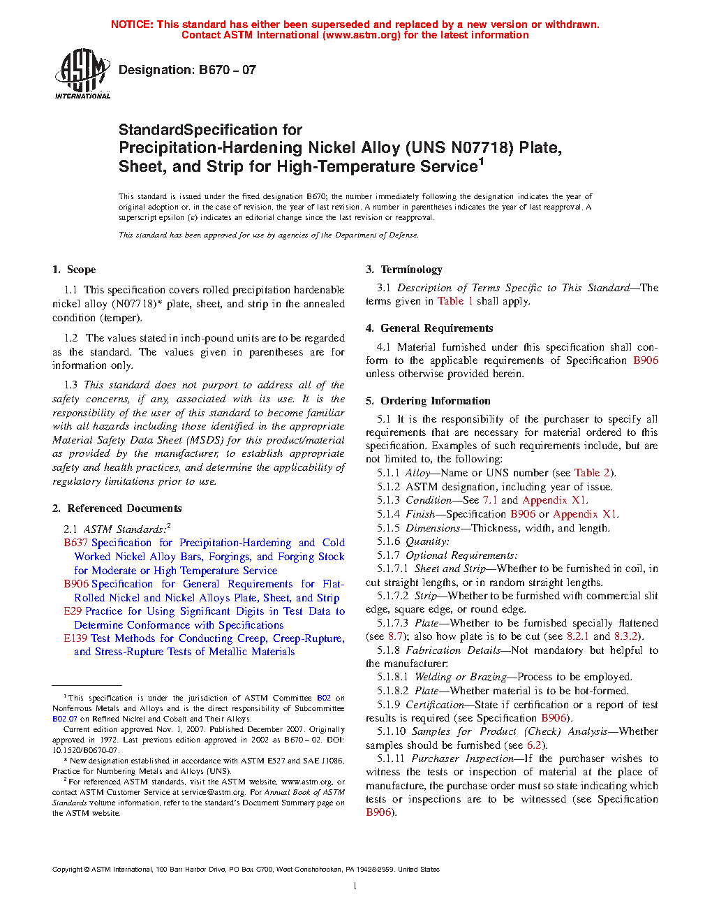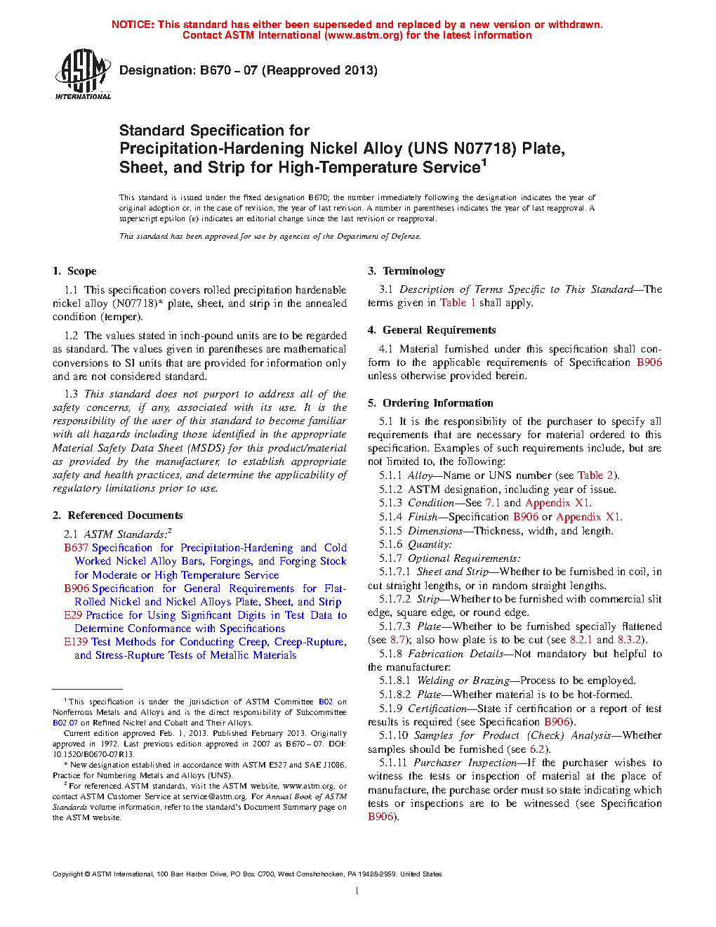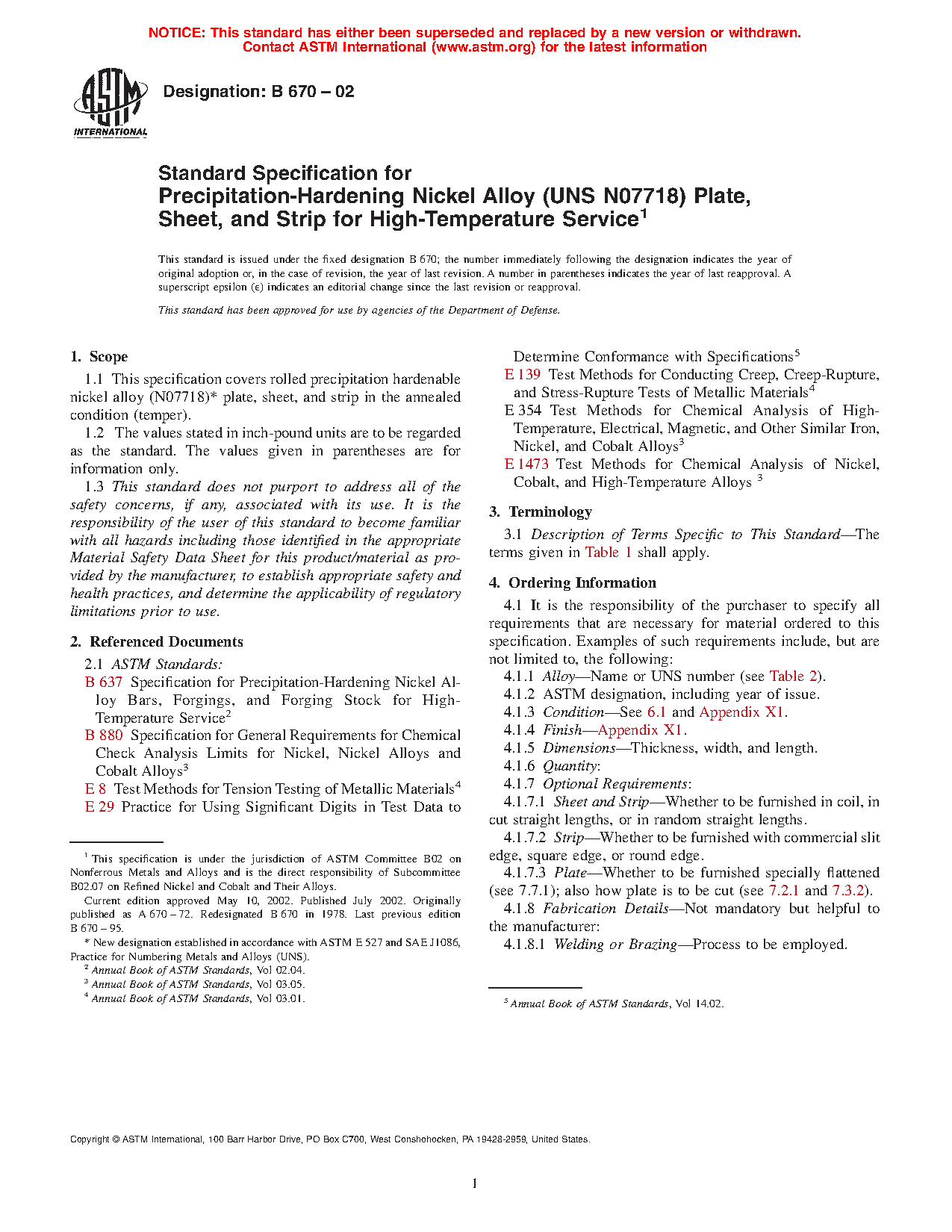 1.1 This specification covers rolled precipitation hardenable nickel alloy (N07718)* plate, sheet, and strip in the annealed condition (temper).