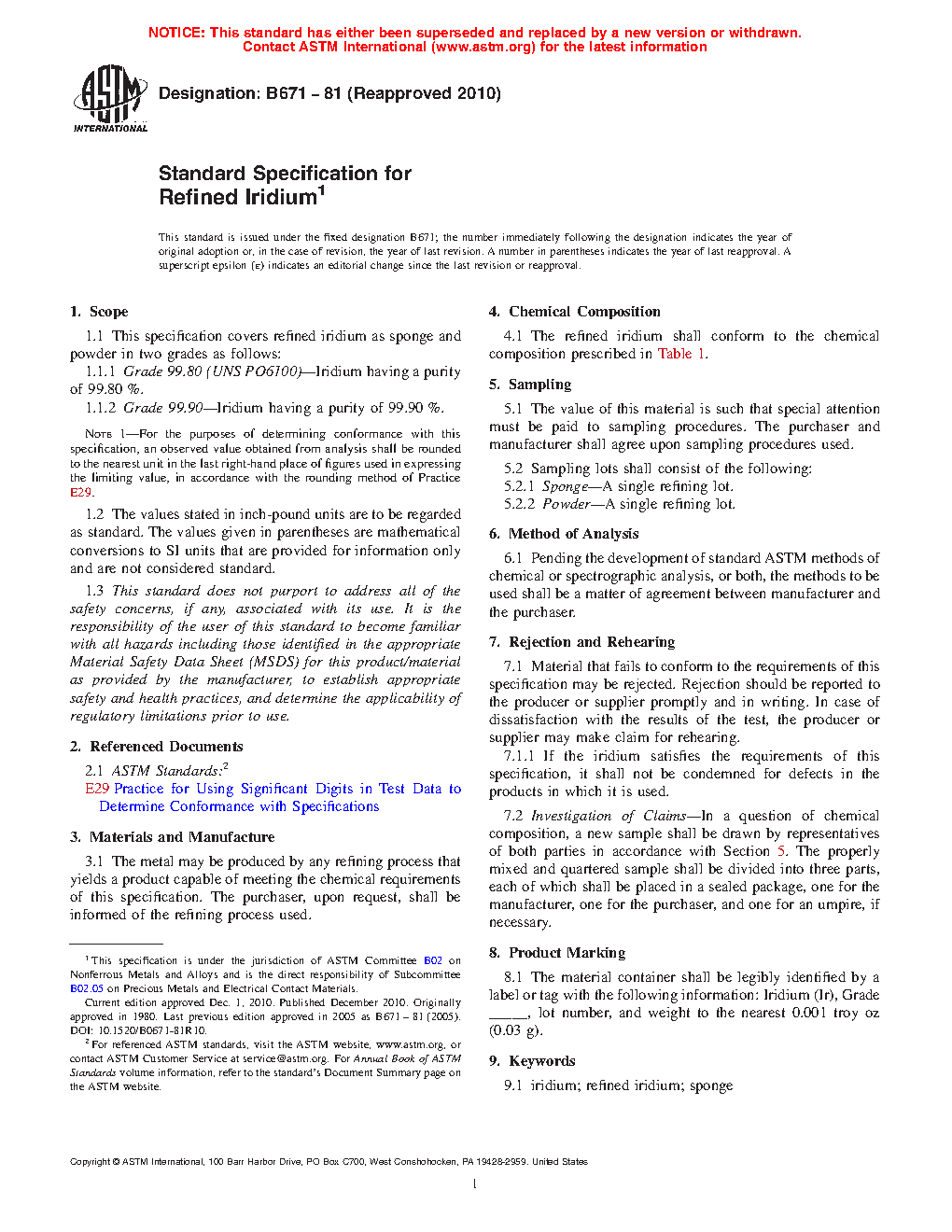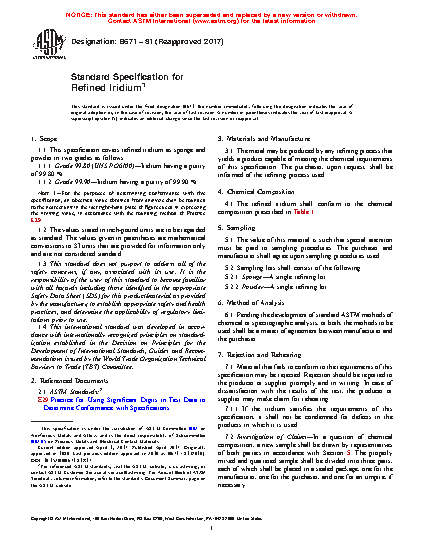 1.1 This specification covers refined iridium as sponge and powder in two grades as follows: