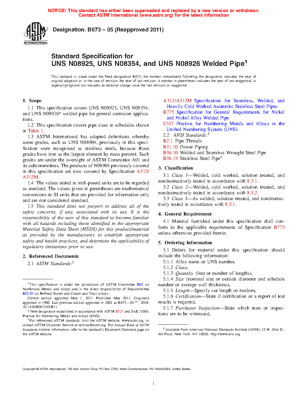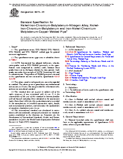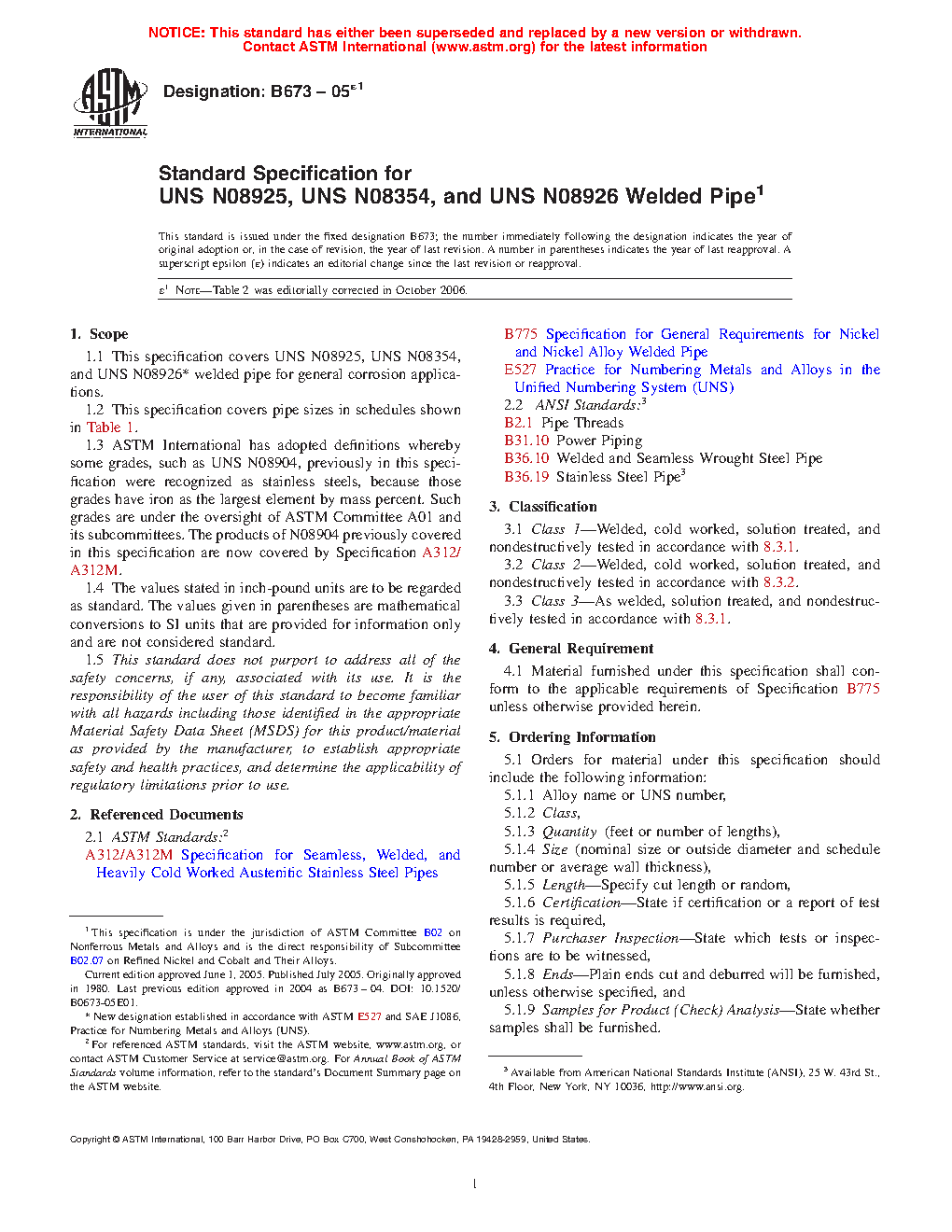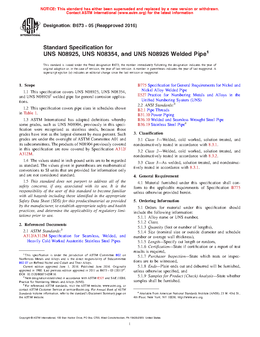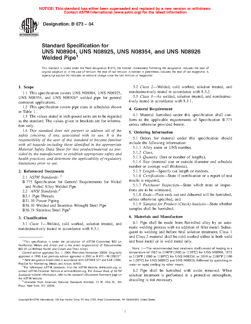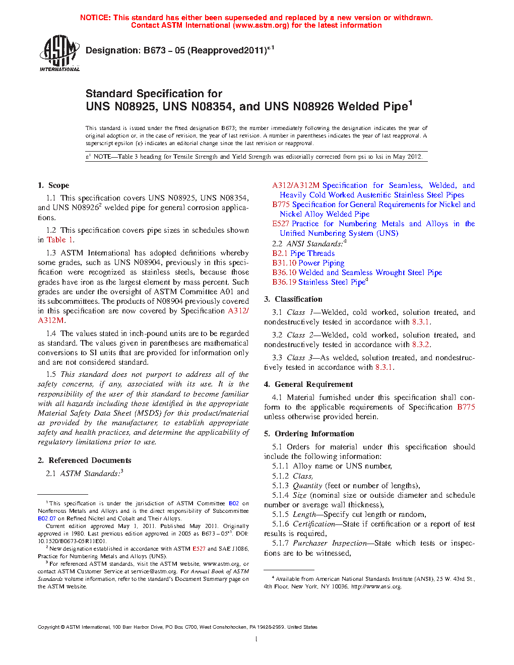 1.1 This specification covers UNS N08925, UNS N08354, and UNS N089262 welded pipe for general corrosion applications.