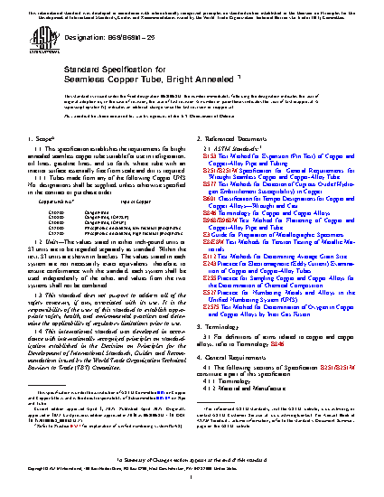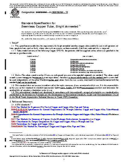 1.1 This specification establishes the requirements for bright annealed seamless copper tube suitable for use in refrigeration, oil lines, gasoline lines, and so forth, where tube with an interior surface essentially free from scale and dirt is required.