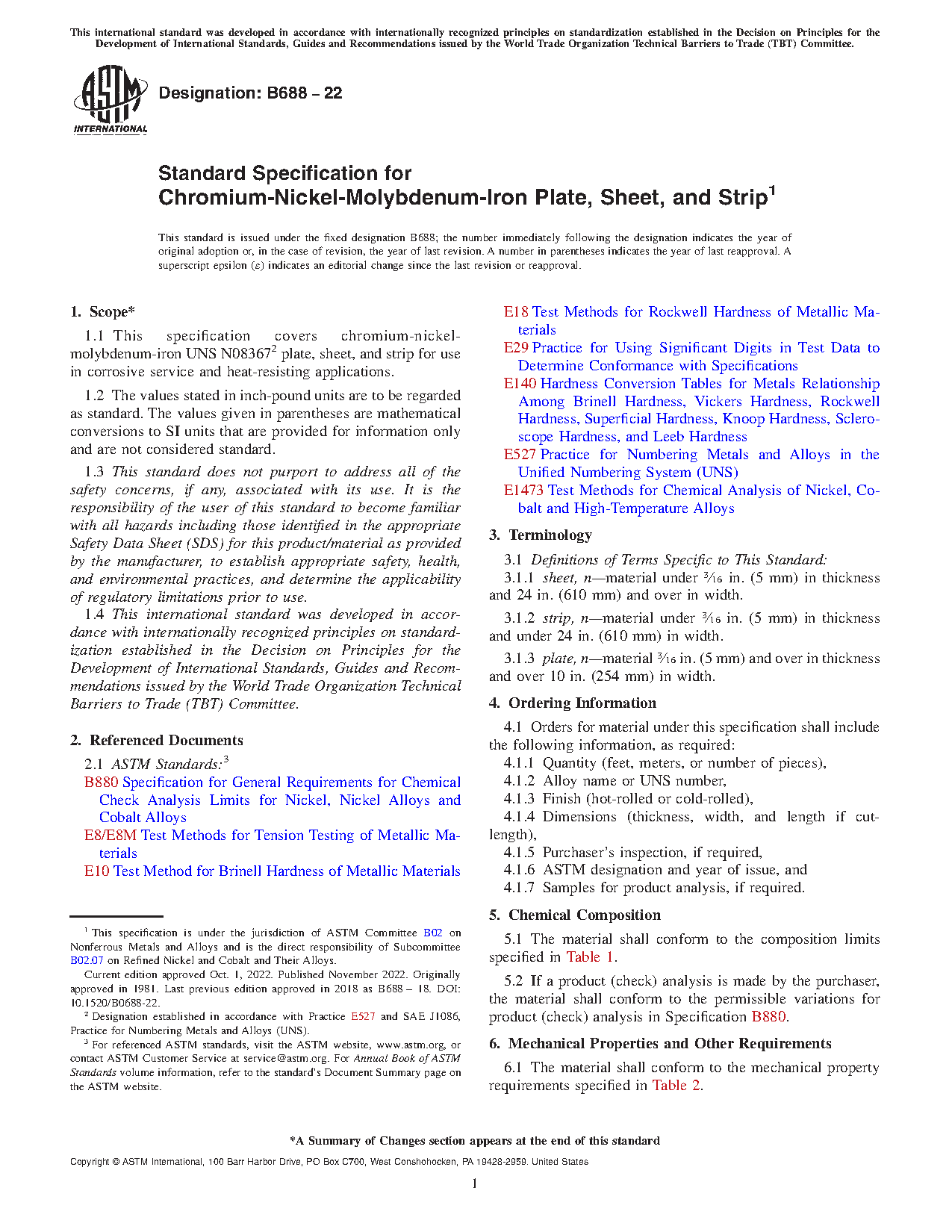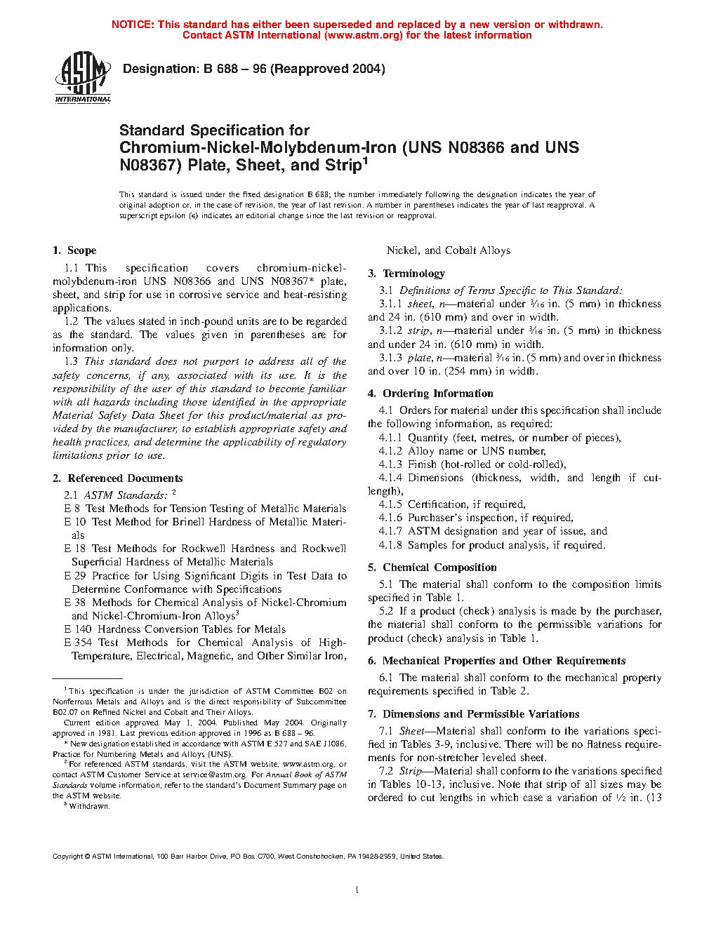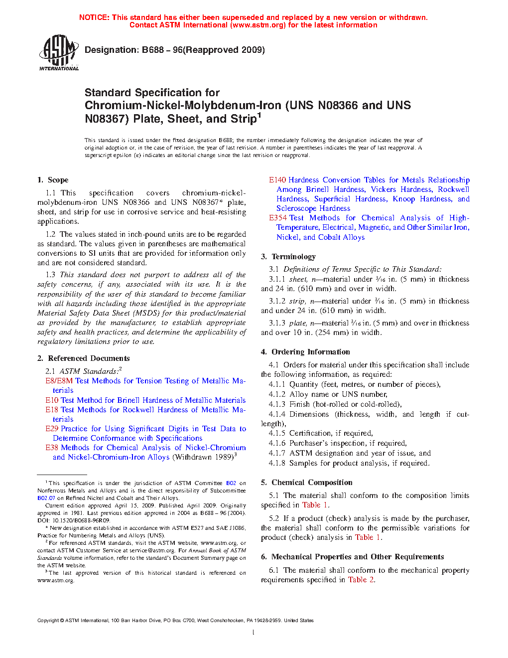 1.1 This specification covers chromium-nickel-molybdenum-iron UNS N08366 and UNS N08367* plate, sheet, and strip for use in corrosive service and heat-resisting applications.