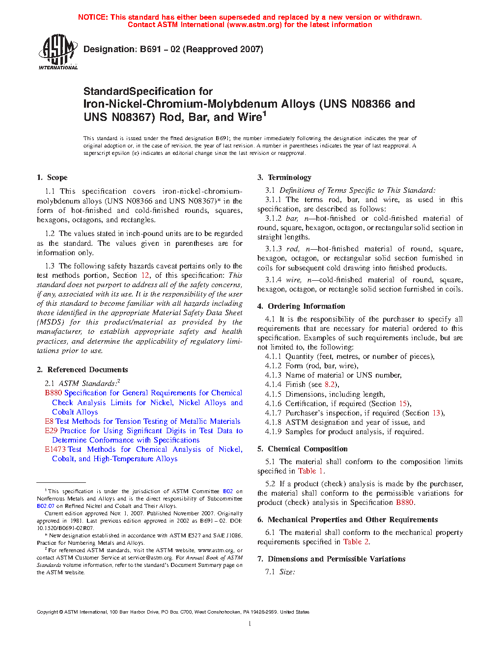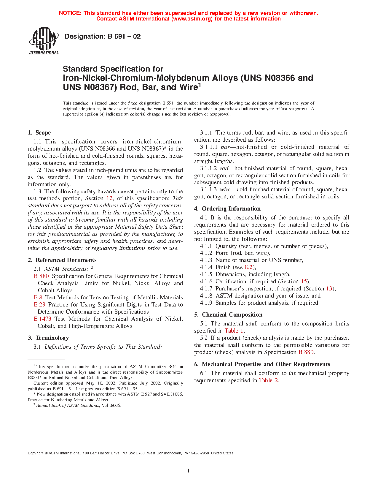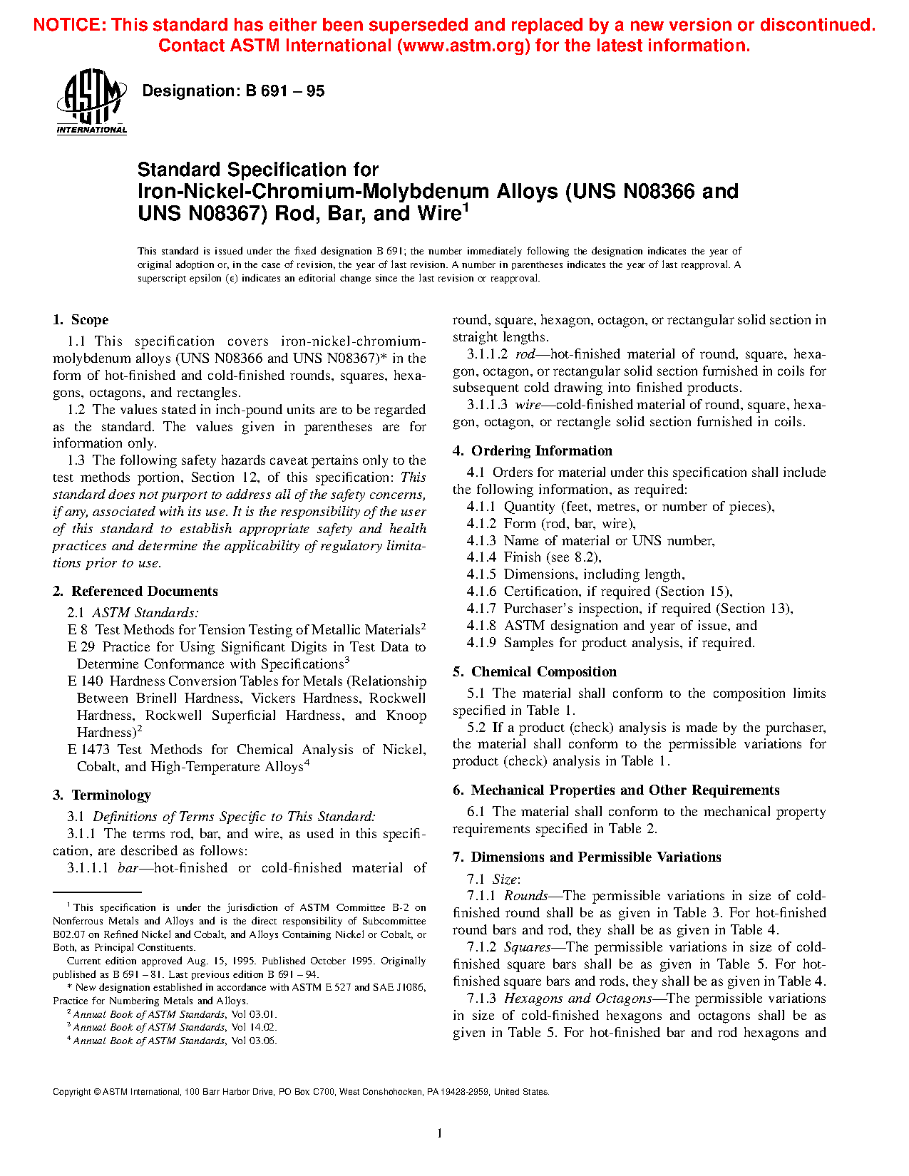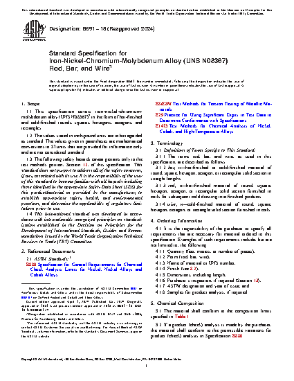 1.1 This specification covers iron-nickel-chromium-molybdenum alloy (UNS N08367)2 in the form of hot-finished and cold-finished rounds, squares, hexagons, octagons, and rectangles.