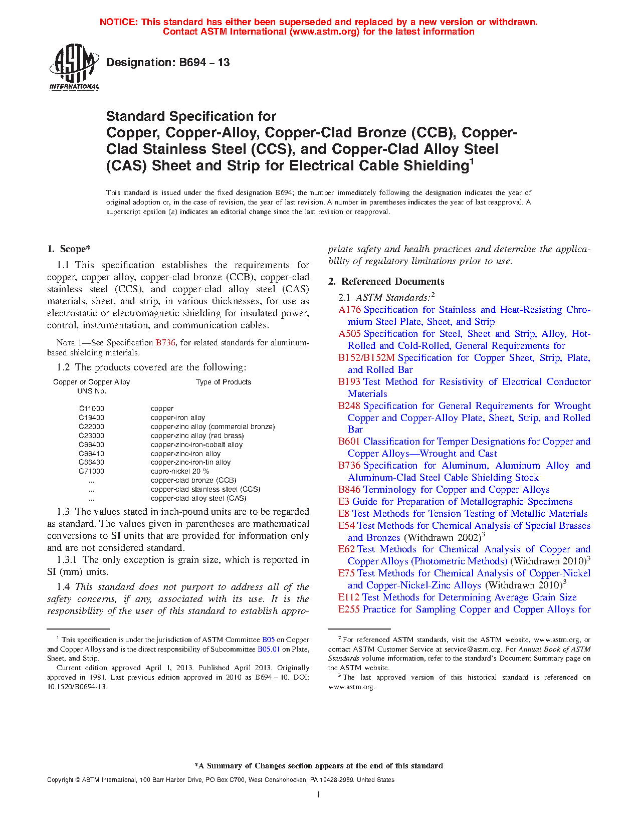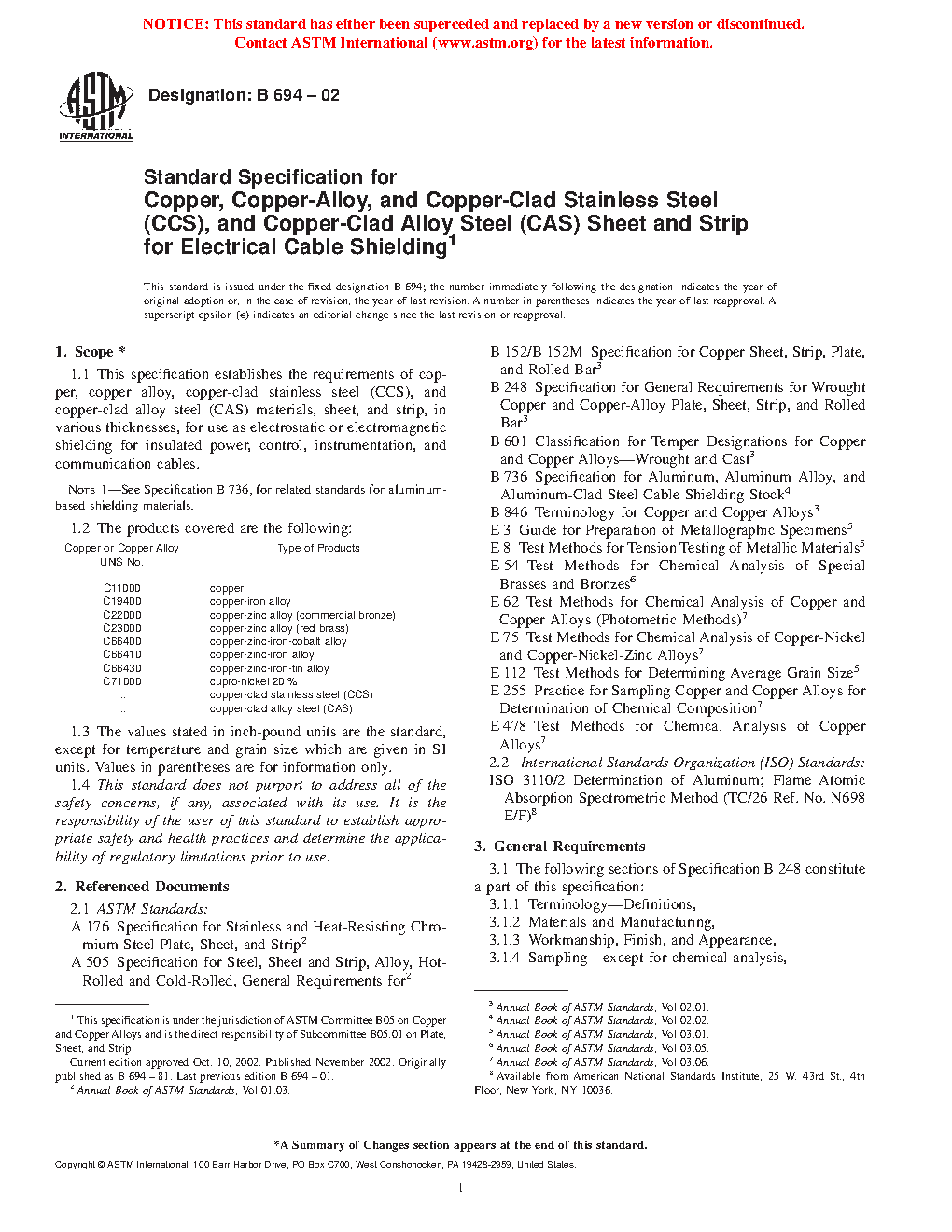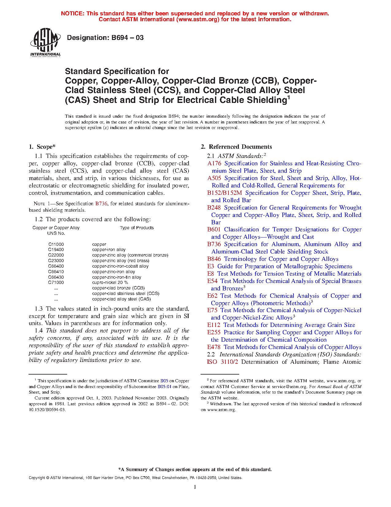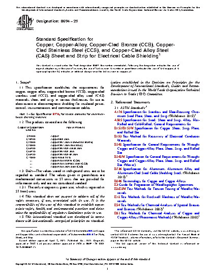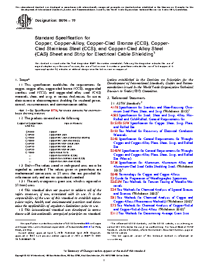 1.1 This specification establishes the requirements for copper, copper alloy, copper-clad bronze (CCB), copper-clad stainless steel (CCS), and copper-clad alloy steel (CAS) materials, sheet, and strip, in various thicknesses, for use as electrostatic or electromagnetic shielding for insulated power, control, instrumentation, and communication cables.