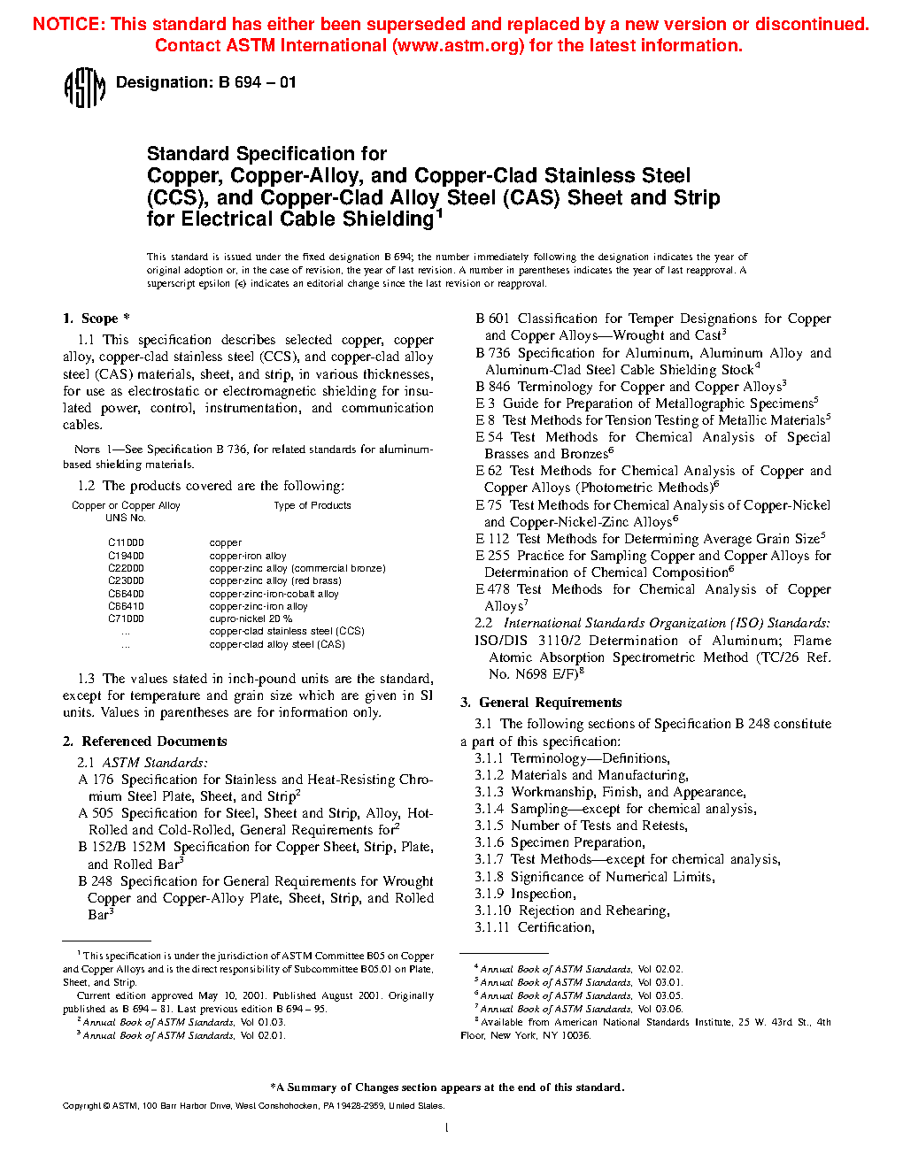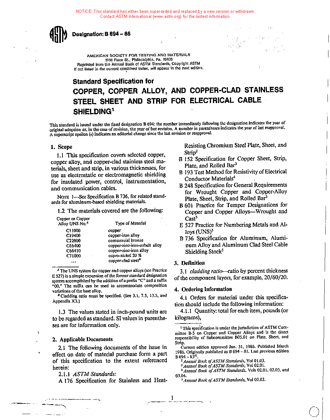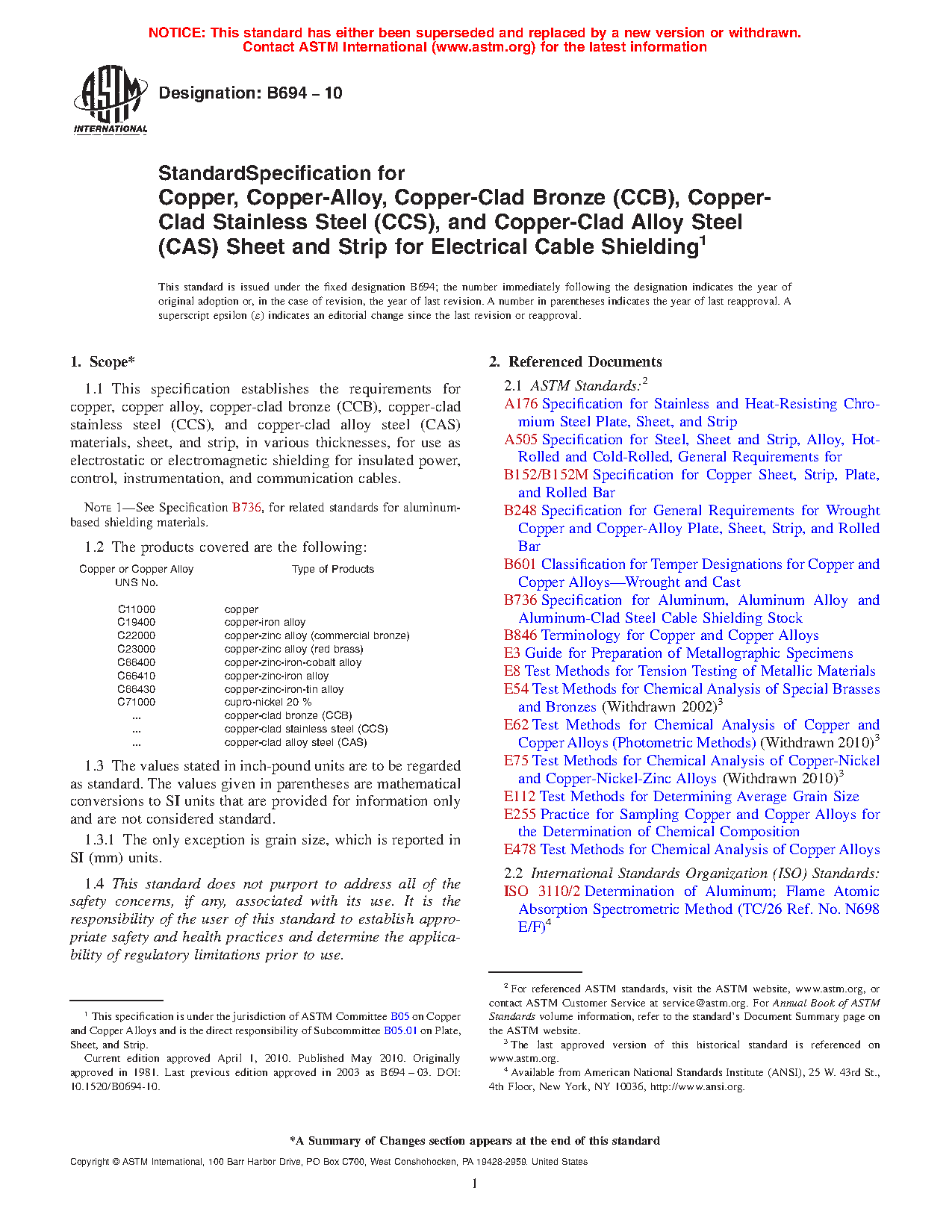 1.1 This specification establishes the requirements for copper, copper alloy, copper-clad bronze (CCB), copper-clad stainless steel (CCS), and copper-clad alloy steel (CAS) materials, sheet, and strip, in various thicknesses, for use as electrostatic or electromagnetic shielding for insulated power, control, instrumentation, and communication cables.