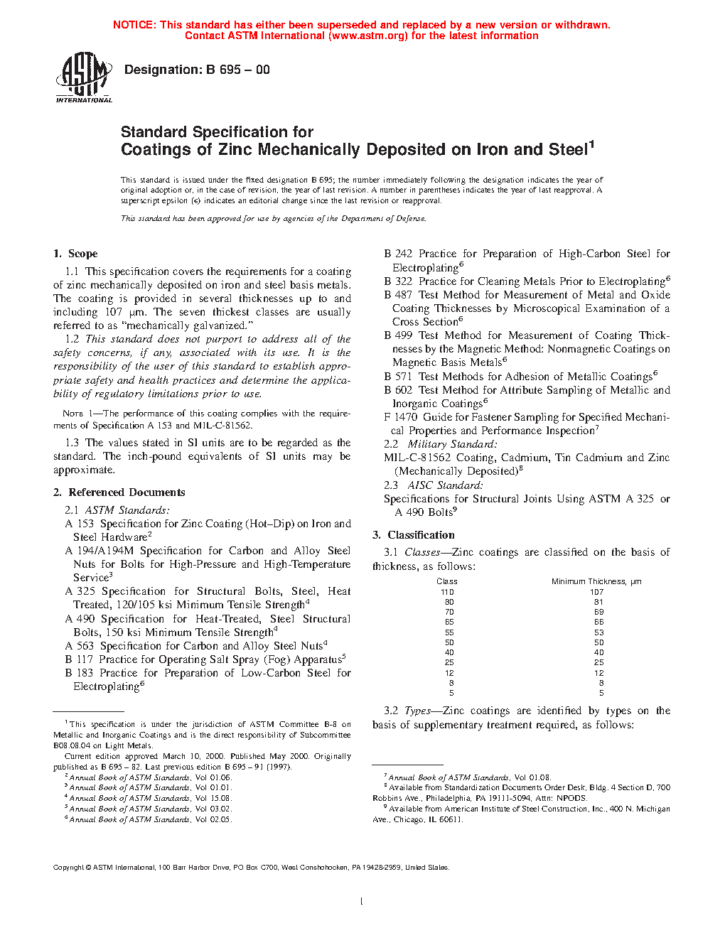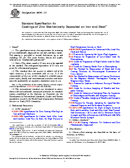 1.1 This specification covers the requirements for a coating of zinc mechanically deposited on iron and steel basis metals. The coating is provided in several thicknesses up to and including 107 μm. The seven thickest classes are usually referred to as “mechanically galvanized.”