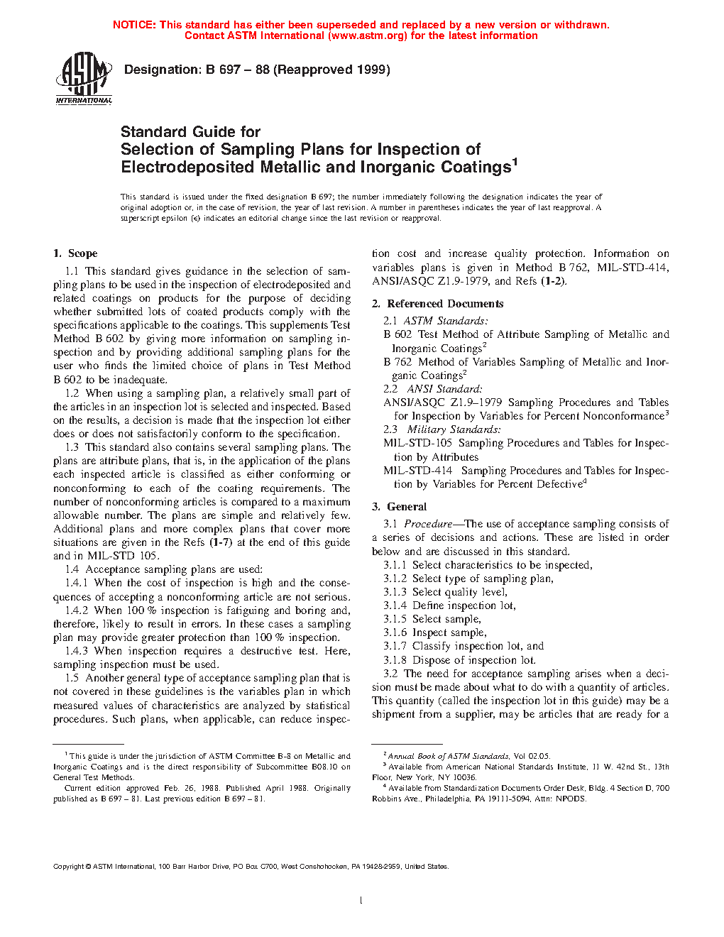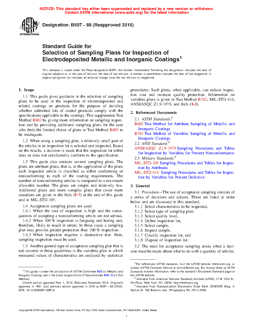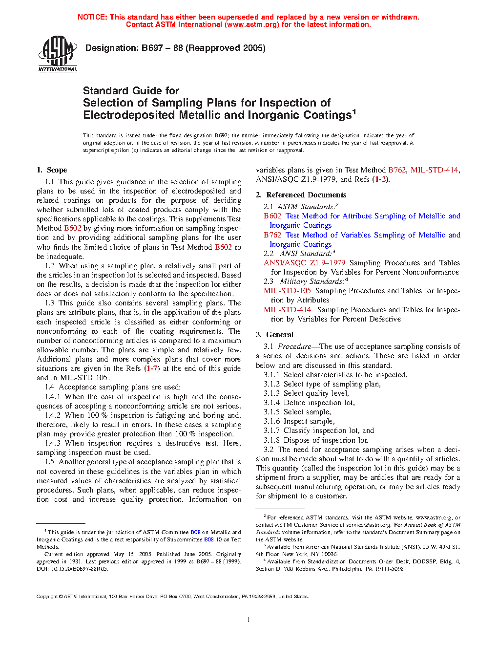 1.1 This guide gives guidance in the selection of sampling plans to be used in the inspection of electrodeposited and related coatings on products for the purpose of deciding whether submitted lots of coated products comply with the specifications applicable to the coatings. This supplements Test Method B602 by giving more information on sampling inspection and by providing additional sampling plans for the user who finds the limited choice of plans in Test Method B602 to be inadequate.