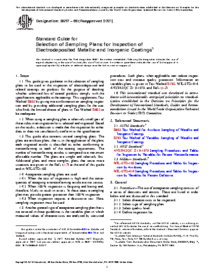 This guide covers the standard method for selecting sampling plans to be used in the inspection of electrodeposited metallic and inorganic coatings on products for the purpose of deciding whether submitted lots comply with the specifications applicable to the coatings. The characteristics of the sampling plan are expressed in terms of the Acceptable Quality Level (AQL), Limiting Quality Level (LQL), Average Outgoing Quality (AOQ), and Average Outgoing Quality Limit (AOQL). General procedures and criteria for the construction and selection of the type of sampling plan, selection of a specific plan, selection of the inspection lot, sampling and inspection of samples, and the disposition of lots are discussed fully.