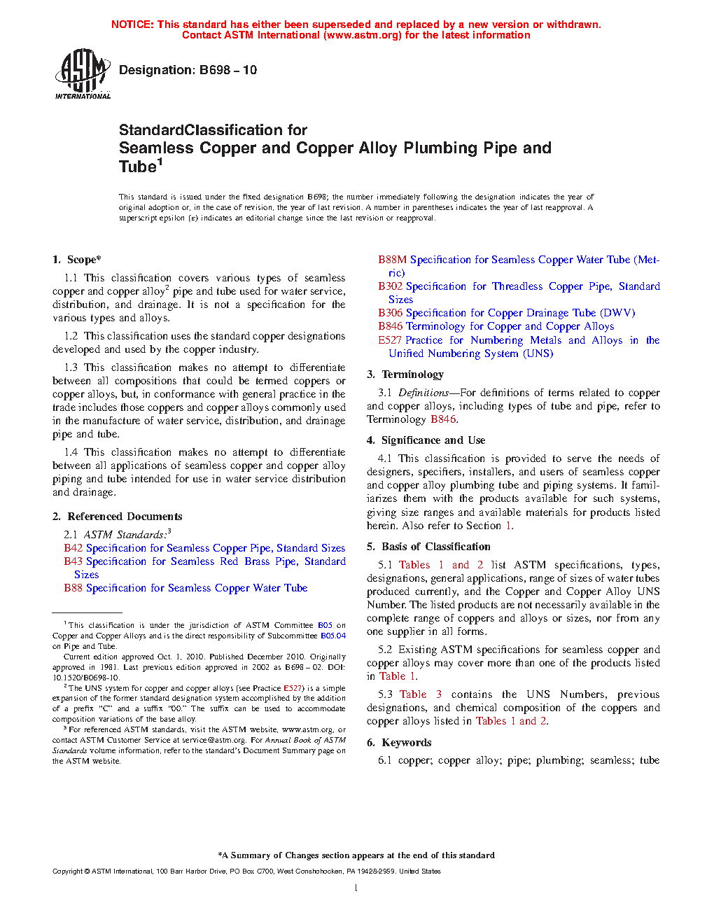 1.3 This classification makes no attempt to differentiate between all compositions that could be termed coppers or copper alloys, but, in conformance with general practice in the trade, includes those coppers and copper alloys commonly used in the manufacture of water service, distribution, and drainage pipe and tube.