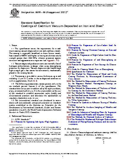 1.1 This specification covers the requirements for a cadmium coating vacuum-deposited on iron and steel basis metals. The coating is especially beneficial to those ferrous metals, heat treated to 46HRC and higher or having an ultimate tensile strength greater than 1500 MPa, wherein protection against corrosion and appearance are important (see Appendix X1).
