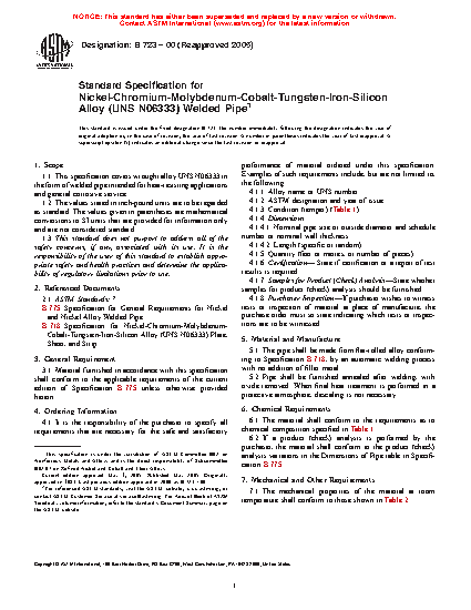 1.1 This specification covers wrought alloy UNS N06333 in the form of welded pipe intended for heat-resisting applications and general corrosive service.